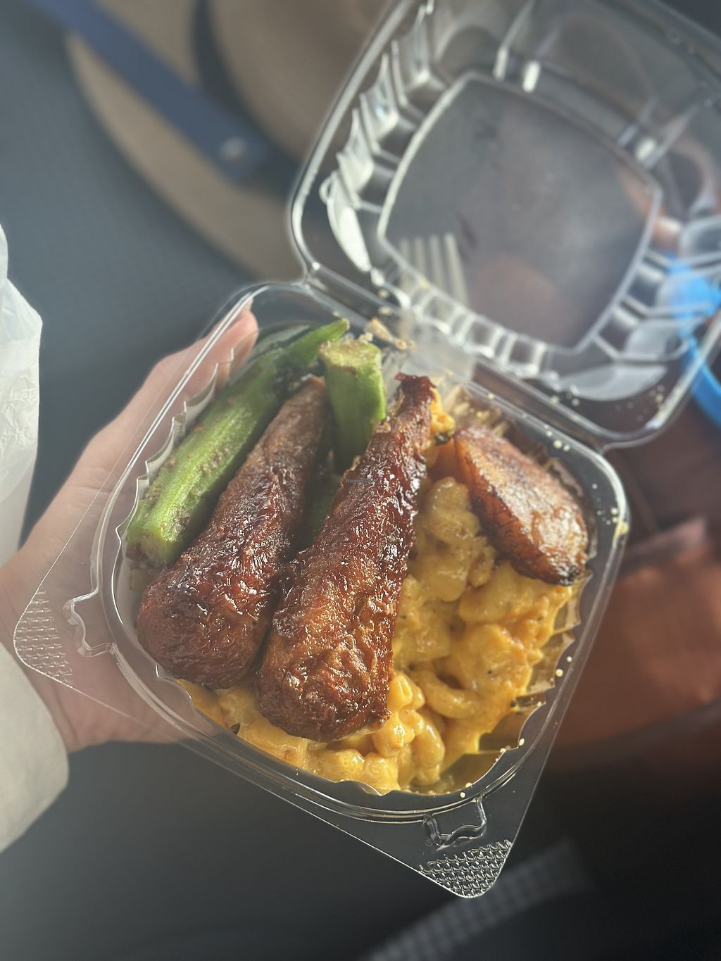 One of the best meals I’ve ever had. We got a medium meal with ginger chicken, bbq drumsticks, and double Mac n cheese, plus an impossible chopped cheese, oyster mushroom burger and brownie cheesecake. It was out of this world.