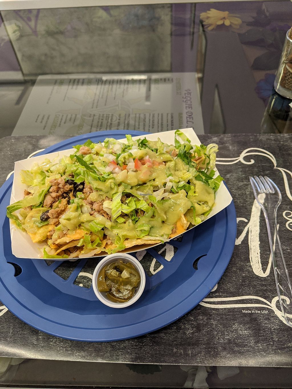 Nachos, plenty of beans and "meat", vegan cheese and guac