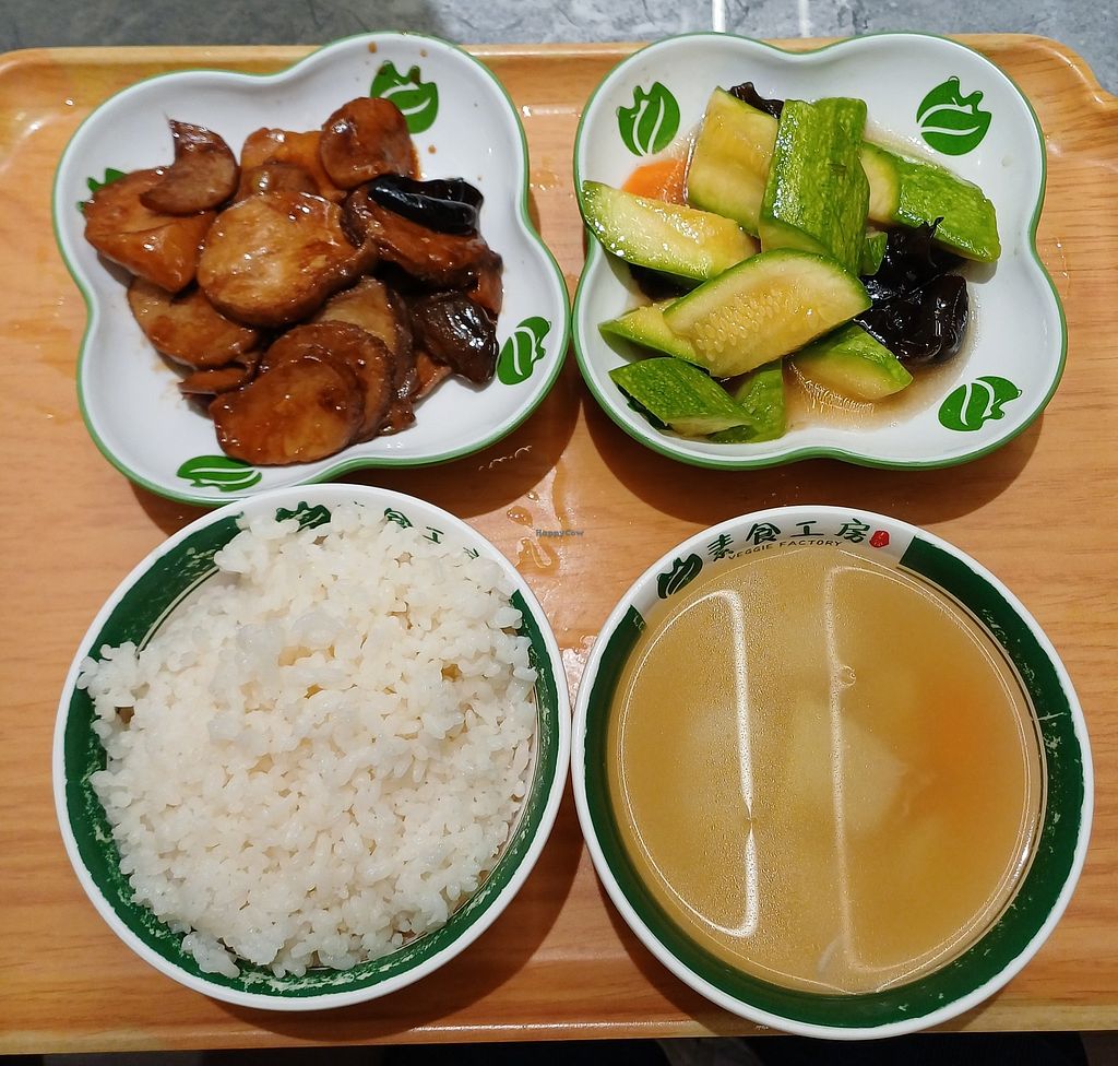 White rice, soup, pan-fried king mushroom with soy sauce, wood ear mus…