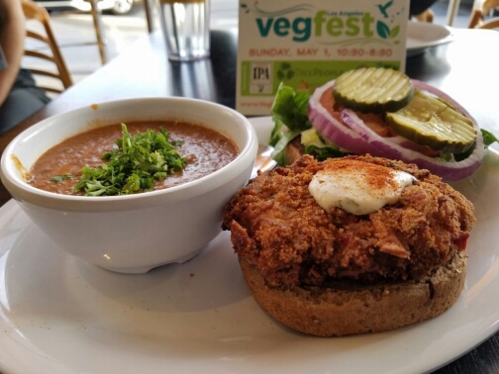 Quinoa veggie burger with avocado and lentil soup. Soup tastes like ch…