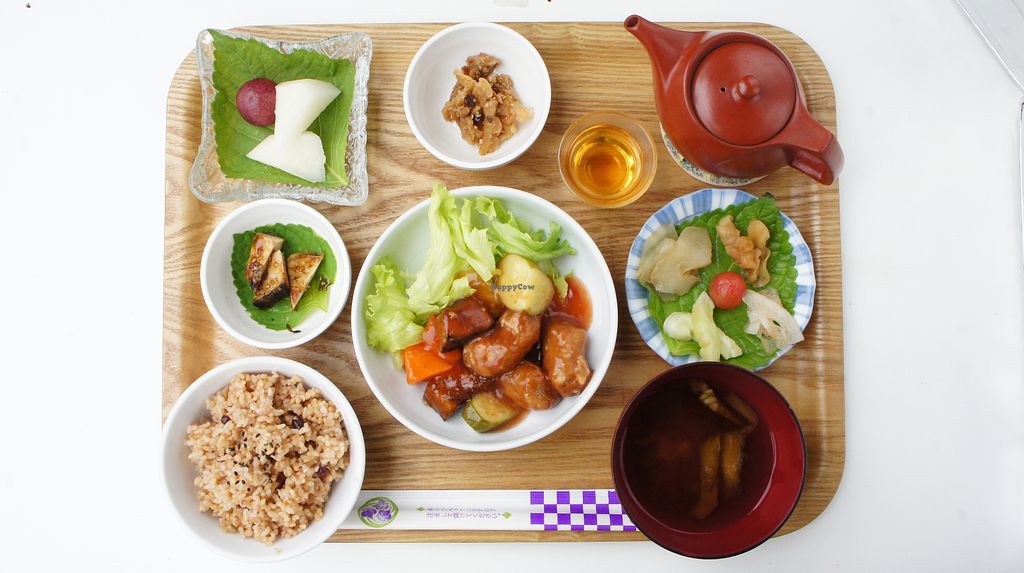 Simple fried fish (vegan), seasonal vegetables and jaozi (vegan)
