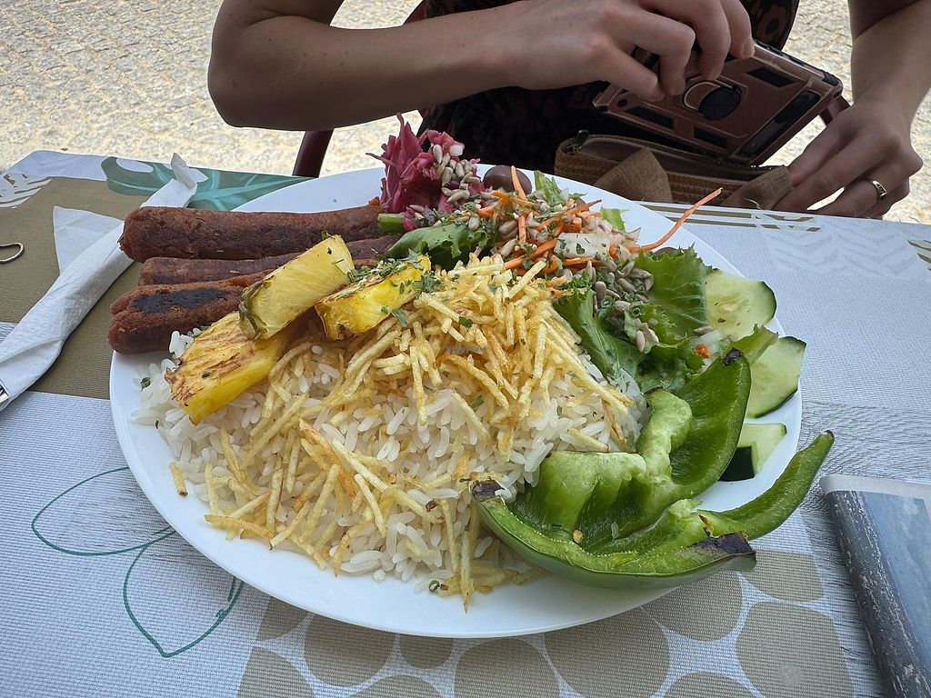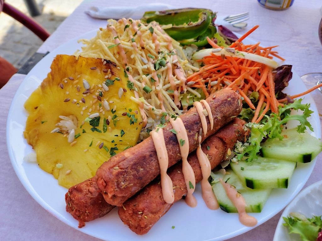 Homemade chorizo style seitan sausages with grilled pineapple, rice an…