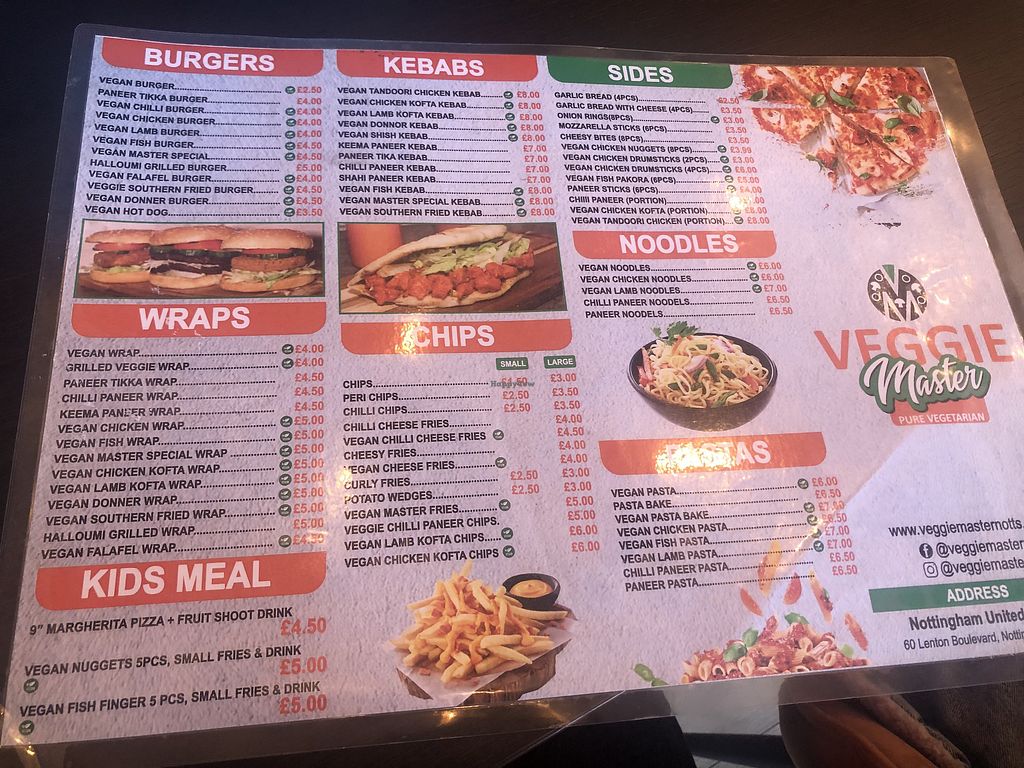 Excellent, massive menu, with loads of labelled vegan options including a range of kebabs, pizzas, wraps, pasta, curries and milkshakes. Fast food type menu, but really good quality. Comfortable, casual cafeteria with lovely service. Very decent prices. Also does takeaway.