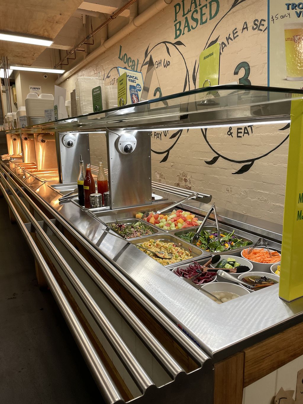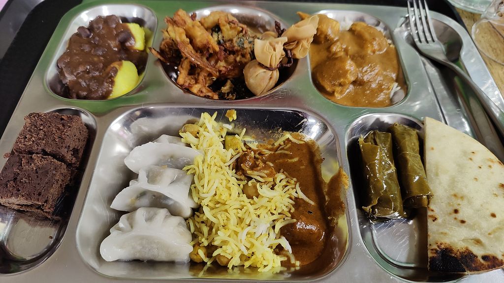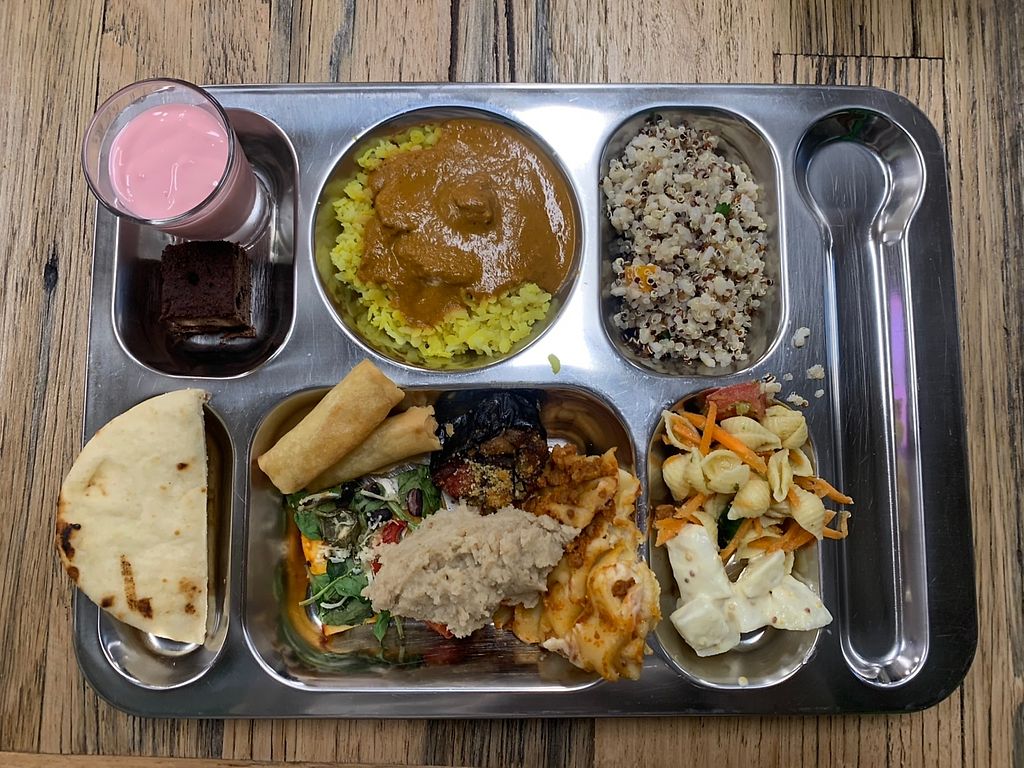 A mix of curry, lasagne, pizza, spring rolls, masala mash, salad and d…