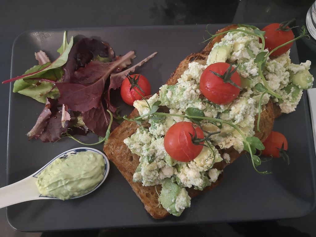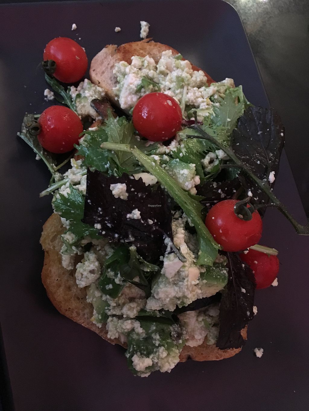 Steamed avocado with crispy tofu smoked bacon, almond cream cheese wit…