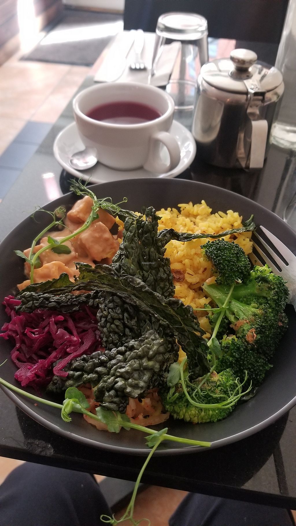 Brunch. Reuben sandwich, pineapple kombucha, Buddah bowl.