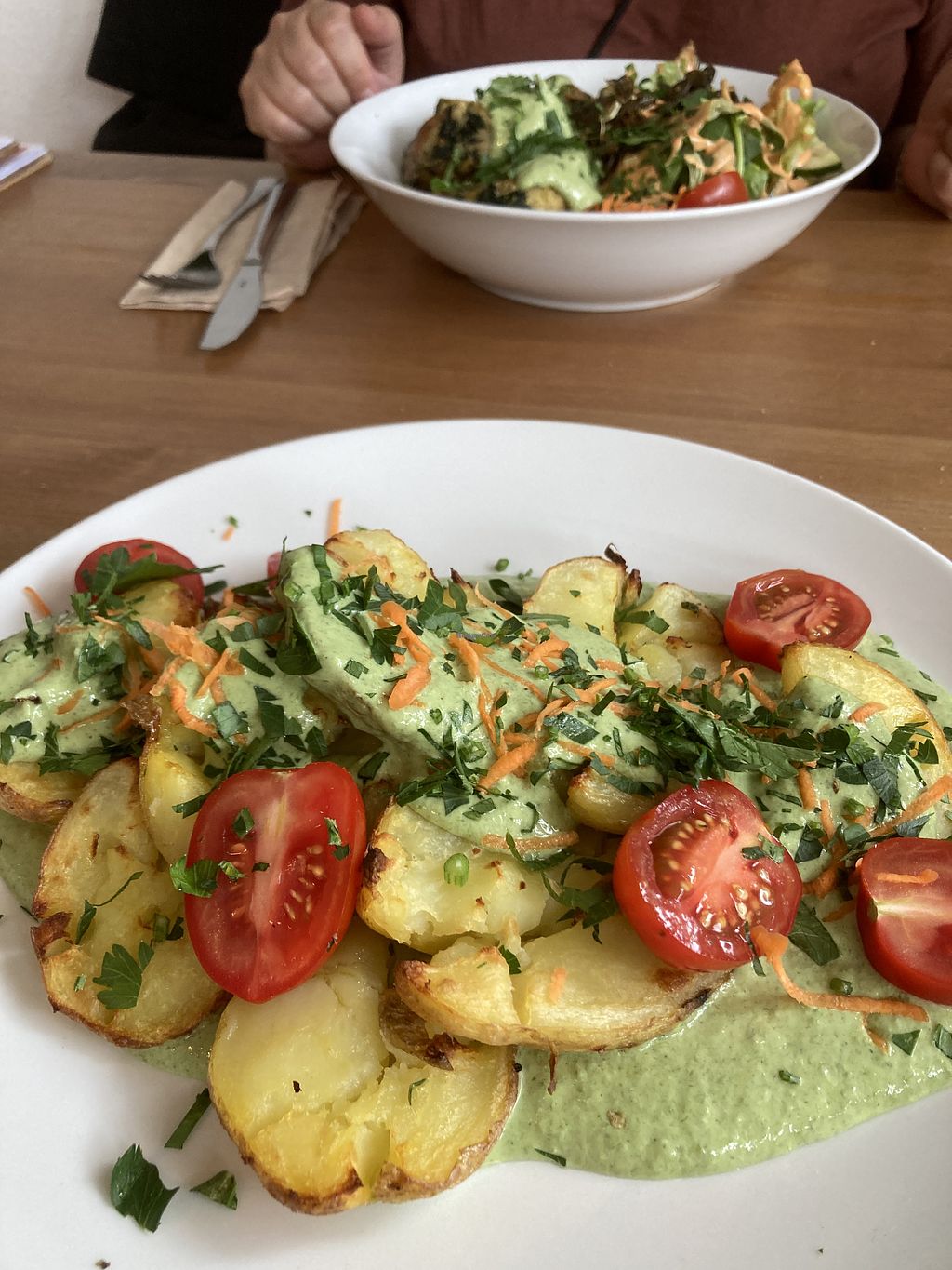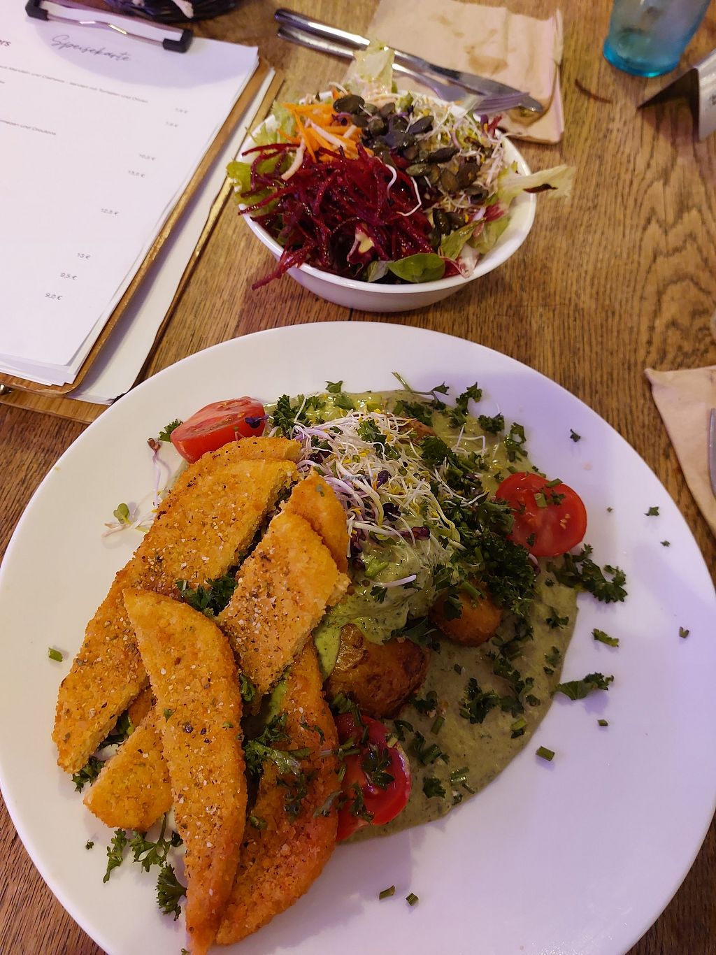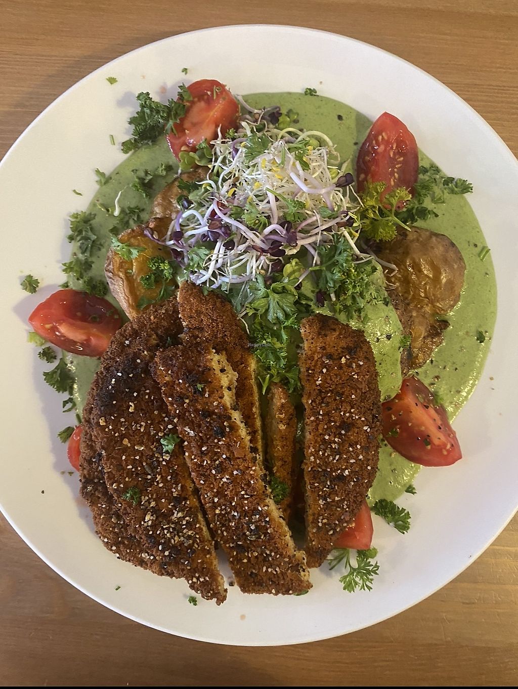 Schnitzel with smashed potatos and green sauce