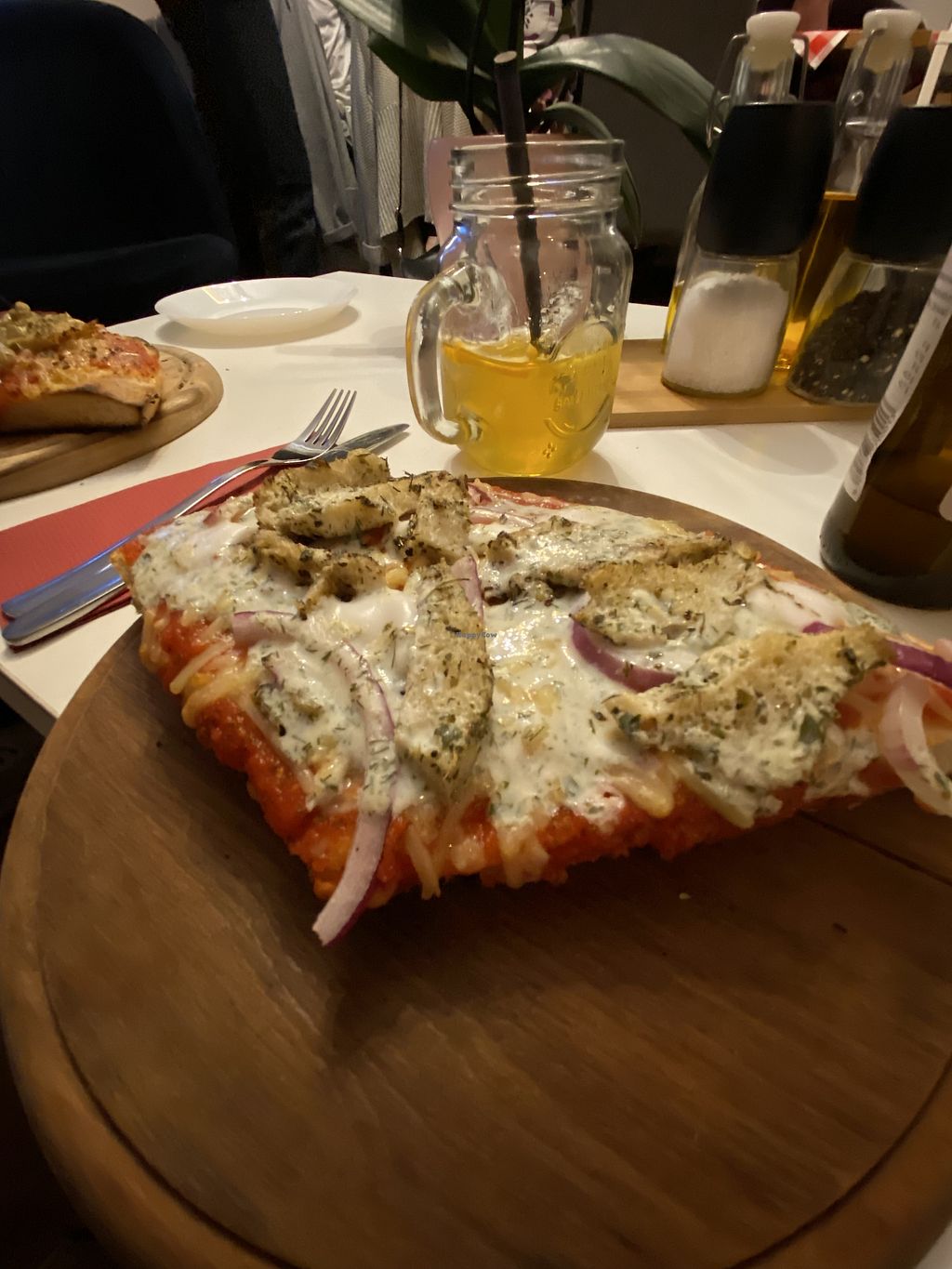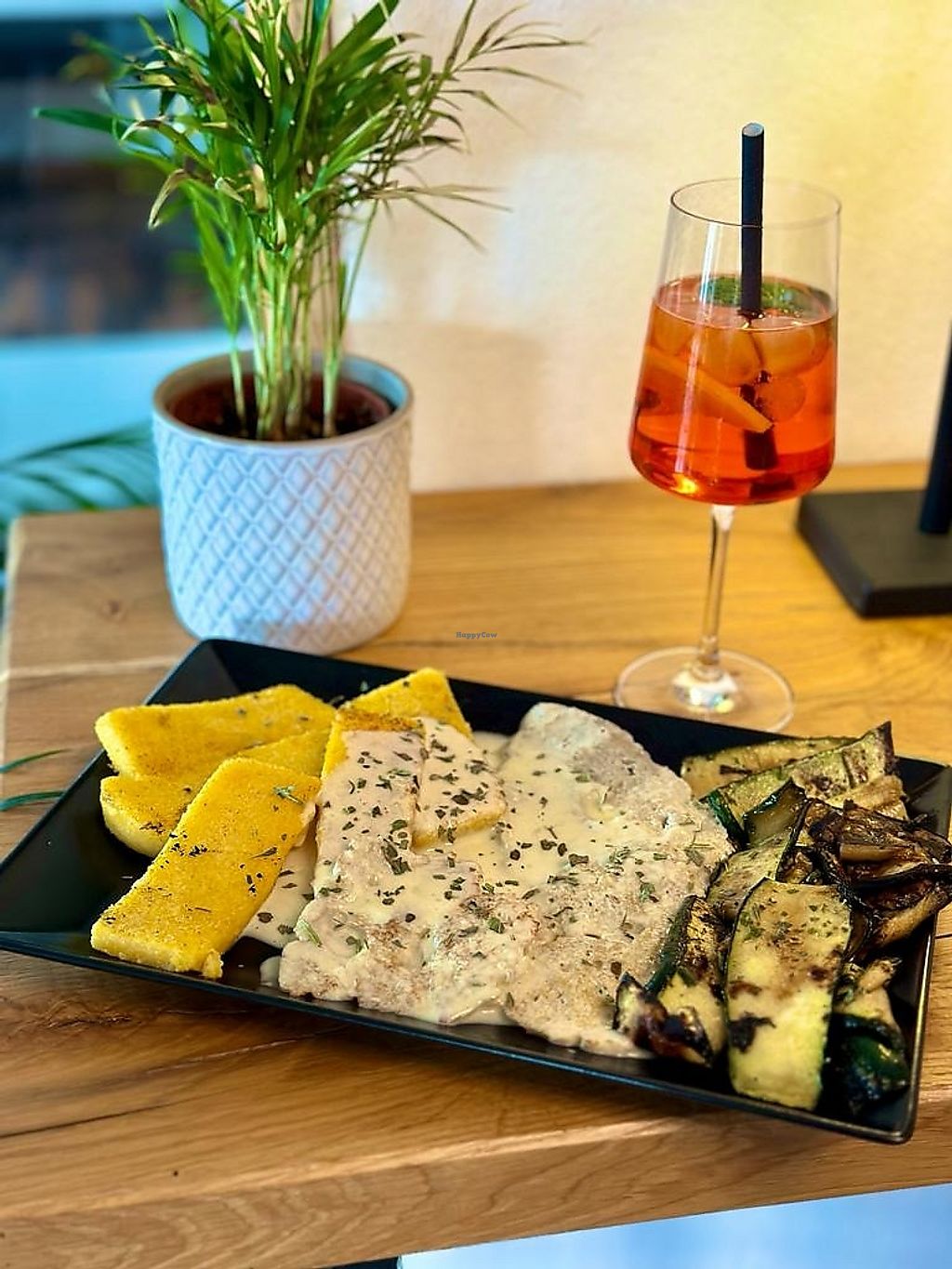 Homemade Vegan chicken in lemon Sauce with grilled vegetables and pole…