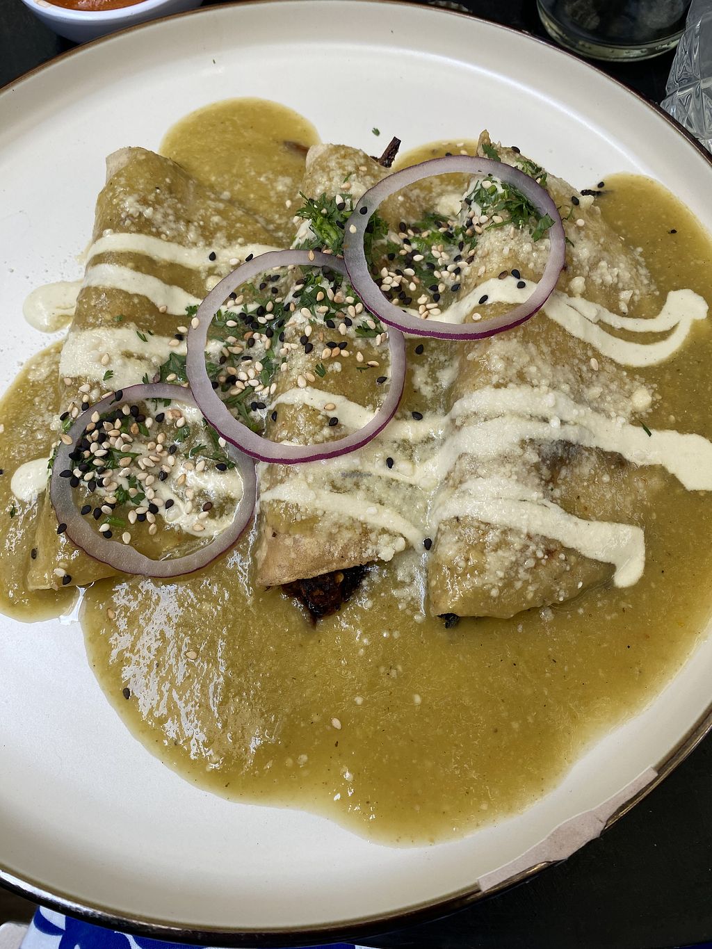 - Enchiladas (1 Tofu Mex, 1 Setas, and 1 Beyond Mex) with green sauce: The Beyond Mex piece was quite good but, unfortunately, the others had very little flavor