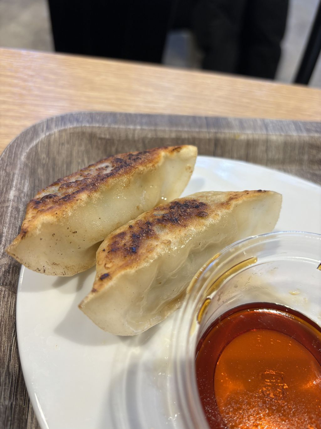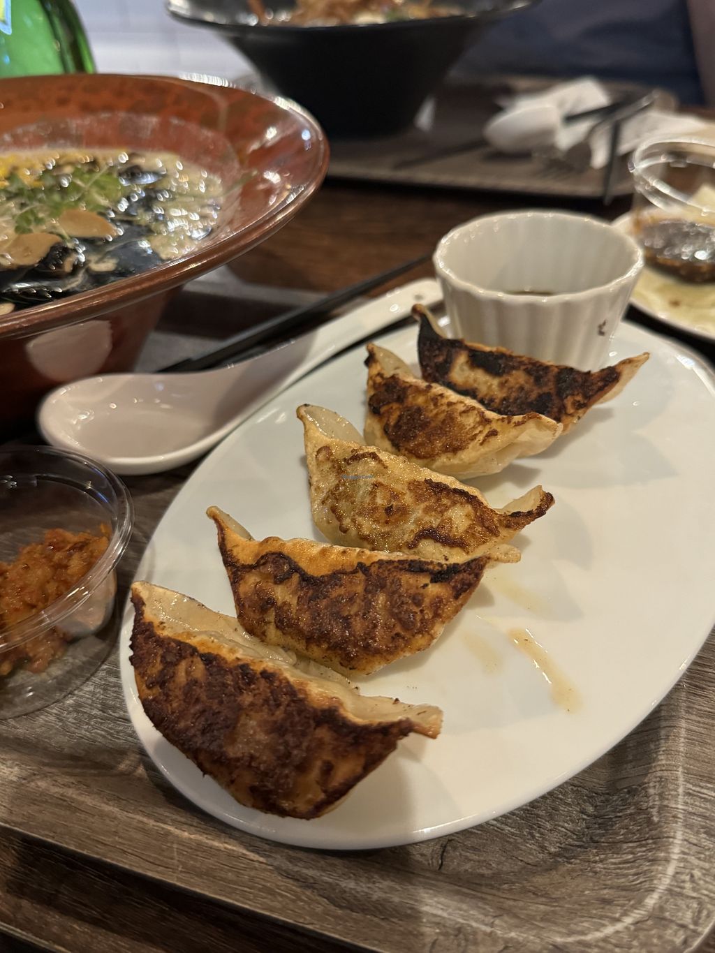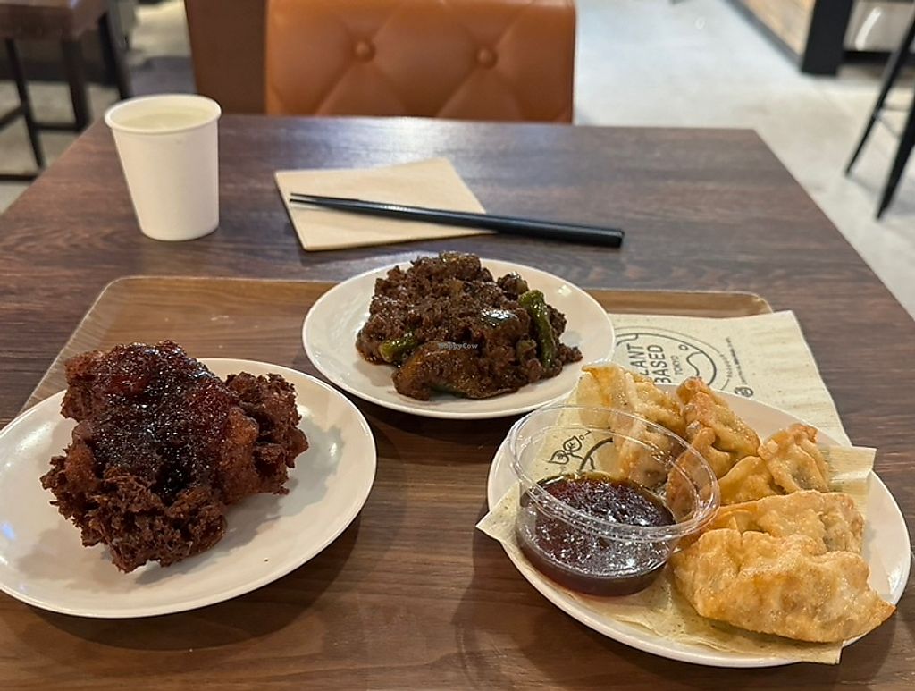 Fried chicken, fried spicy eggplant, and fried gyoza.