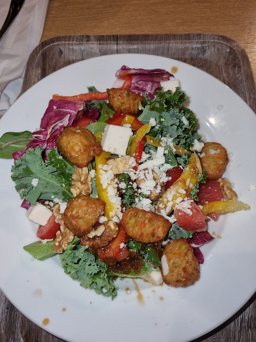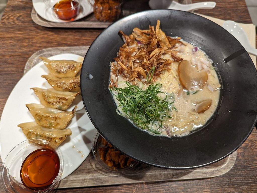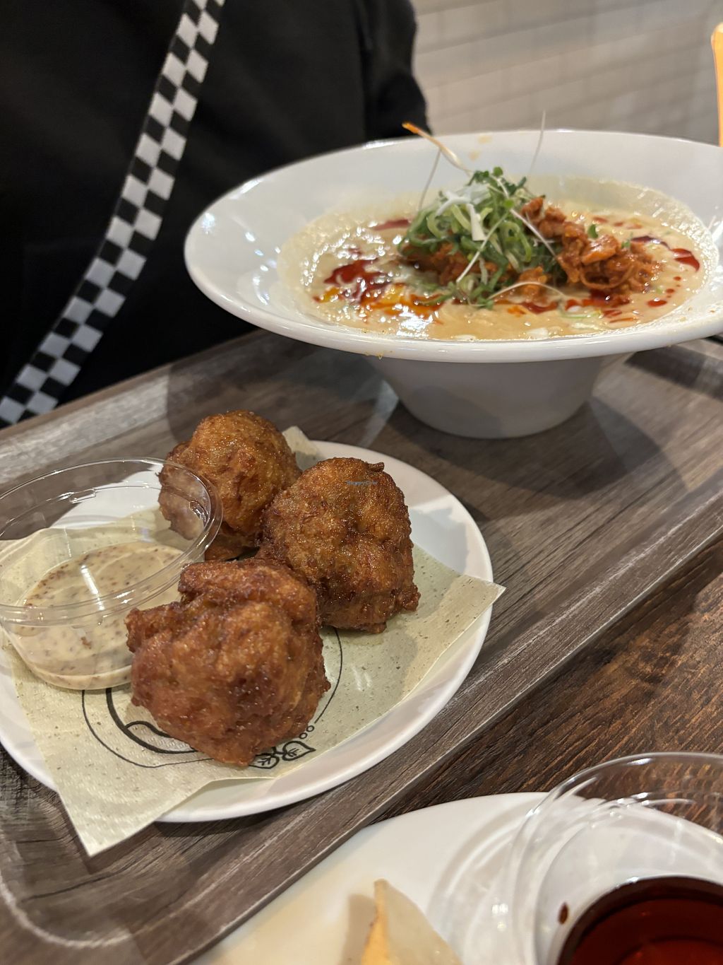 Fried chicken, fried spicy eggplant, and fried gyoza.