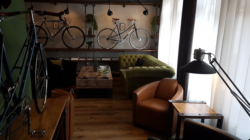 Pros: Atmosphere with real classic bikes on display , Very tasty vegan options , Decor and music