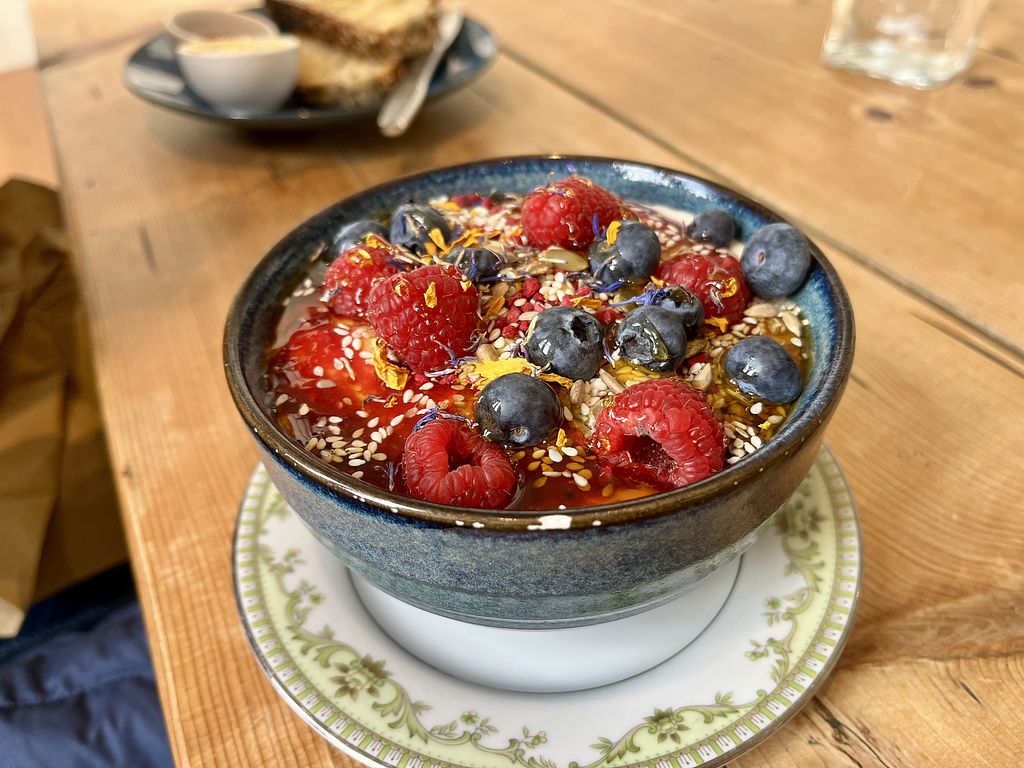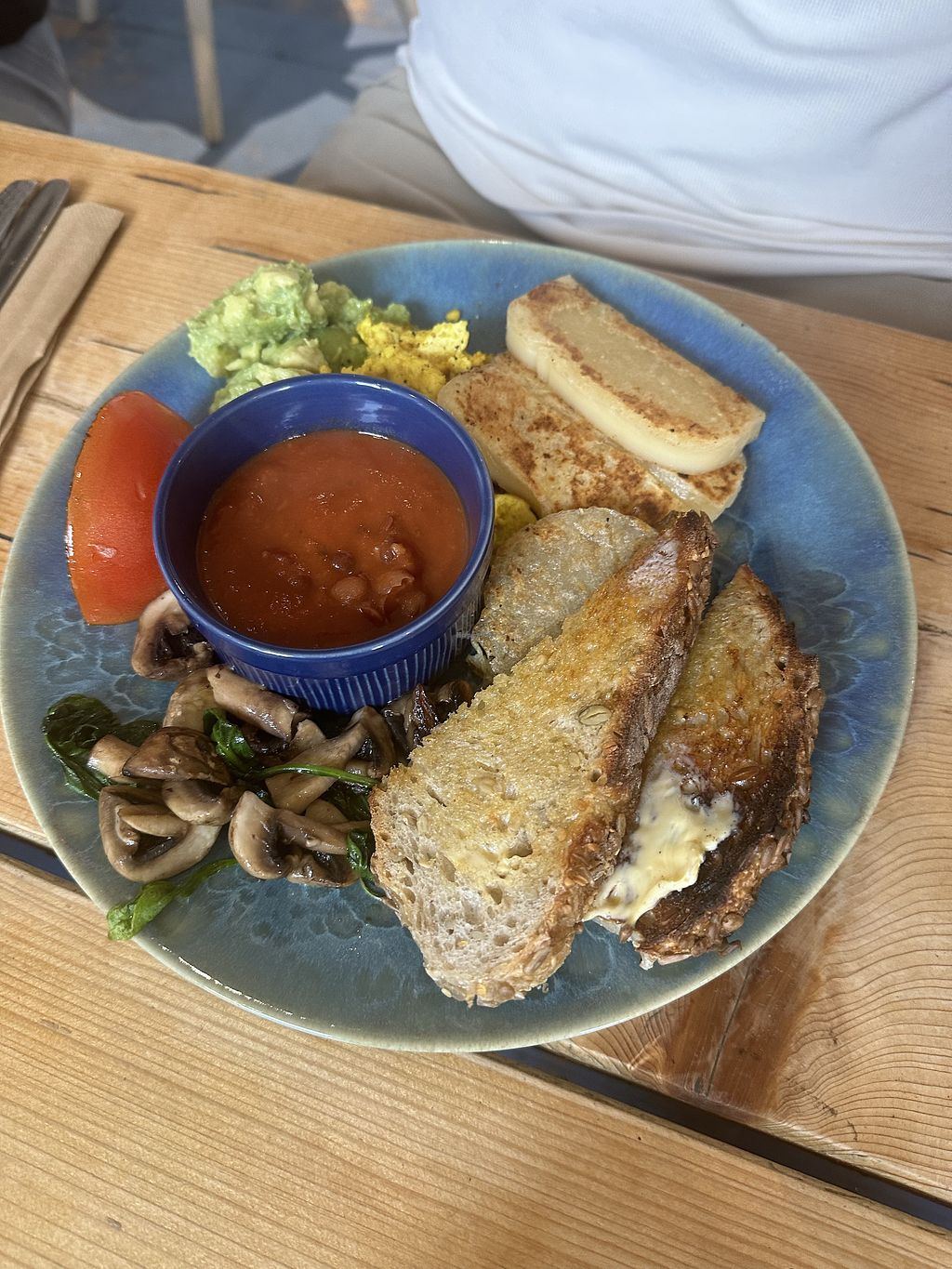 We came here for lunch. We sat down at a shared table as it was busy. The menu noted what could be made vegan. I had the vegan breakfast as I’d wanted to try vegan black pudding and vegan haggis. The whole breakfast was nice. I liked the scrambled tofu and thought it was well spiced. I liked the toast and that it had a vegan butter replacement on it, it was a good sized serve too. My partner had the French toast which could be veganised and enjoyed it. It was topped with berries. I tried it too and enjoyed it. To take away I got a white chocolate and raspberry scroll which was nice.
