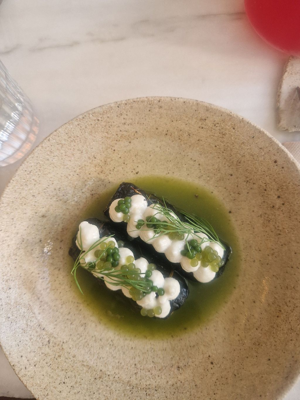 pickled and raw stems · red lentils ‘tofu’ · homemade dashi · globe am…