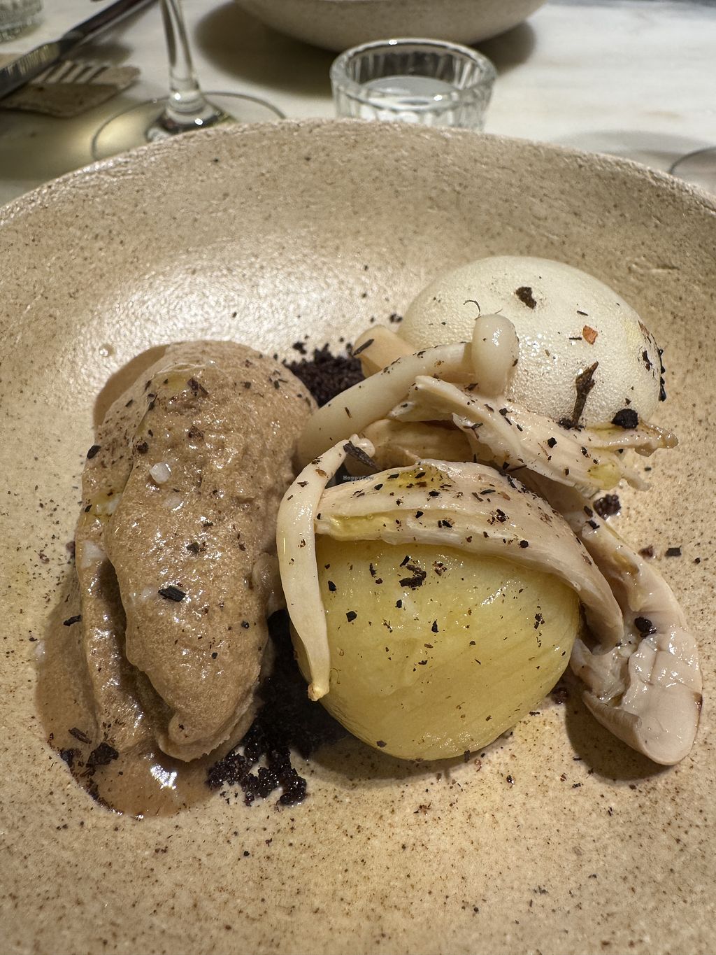 acorn flour · eggplant and sesame cream · pickled stone fruit · nigell…