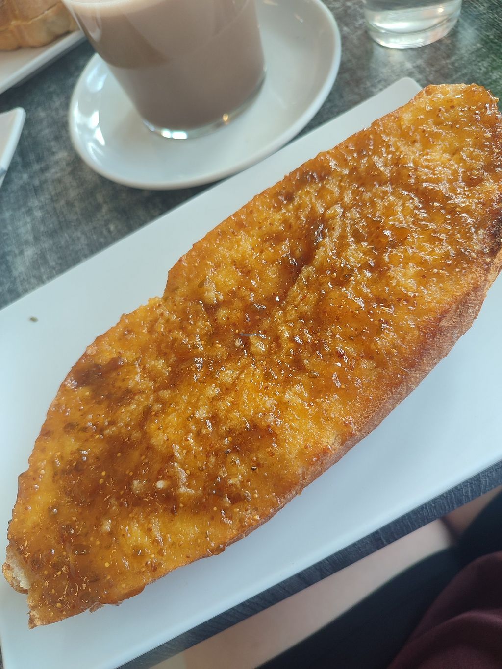 European cafe with vegan choices. Menu includes blueberry croissant, fresh fruit, toasts with vegetable spread, avocado, hummus, jam or vegan cheese and plant-based milk for coffee beverages. Open Mon-Fri 06:30-14:00, Sun 07:30-14:00. Closed Sat.