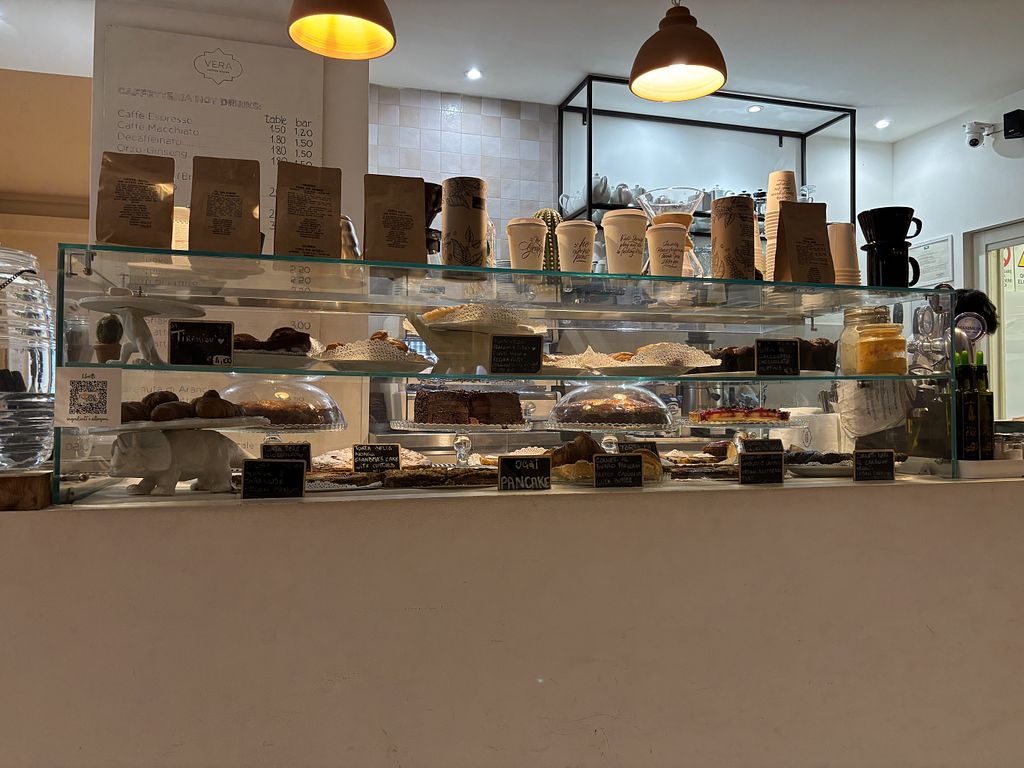 vera is the cutest little cafe on a street without car traffic that has outdoor seating. plenty of vegan pastry options including croissants and tarts. i went later in the day when some vegan options were sold out but got a lovely cappuccino with soy milk and a delicious raspberry tart.