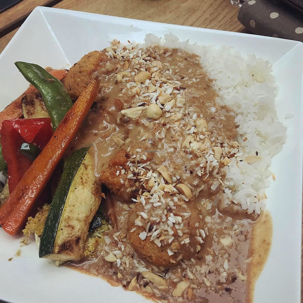 Rice with hummus croquettes, peanut sauce, grilled vegetables.