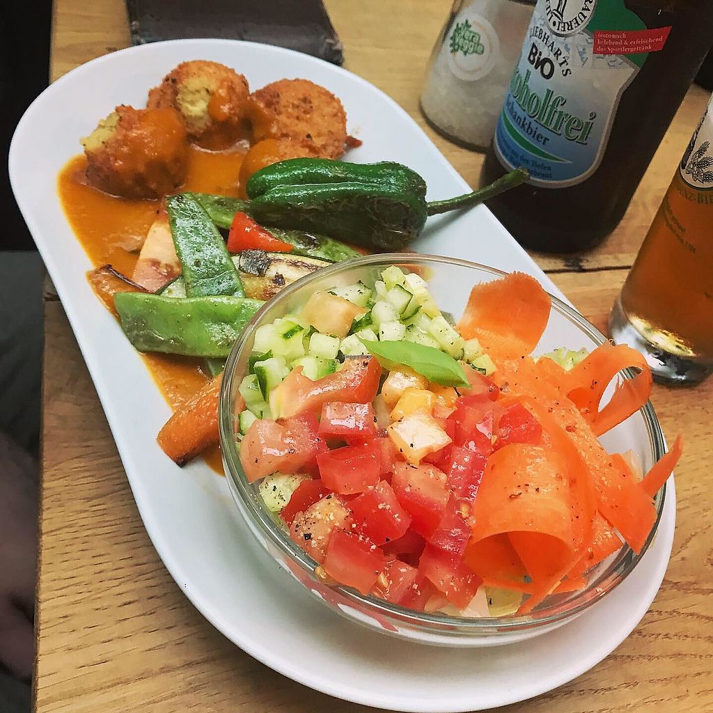 Oriental Teller: Hummus croquette, a sauce with peaces, grilled vegeta…