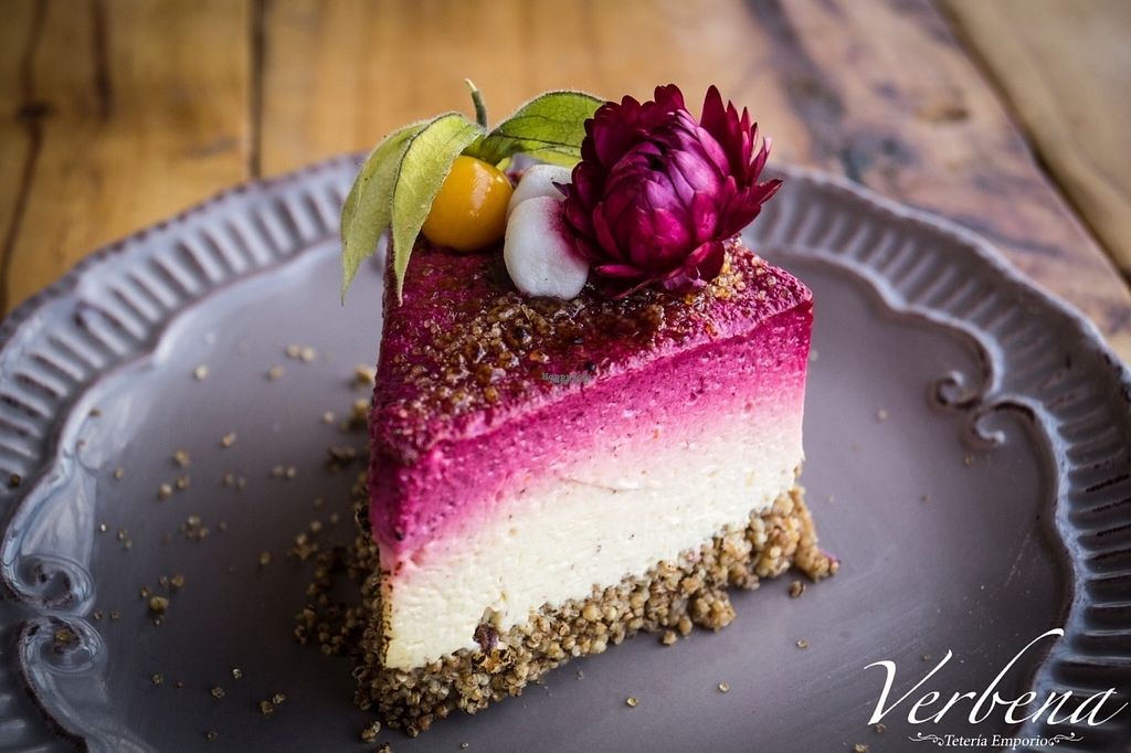 Cheesecake with Quinua Base, Pawpaw, Physalis, Raspberry and Beetroot