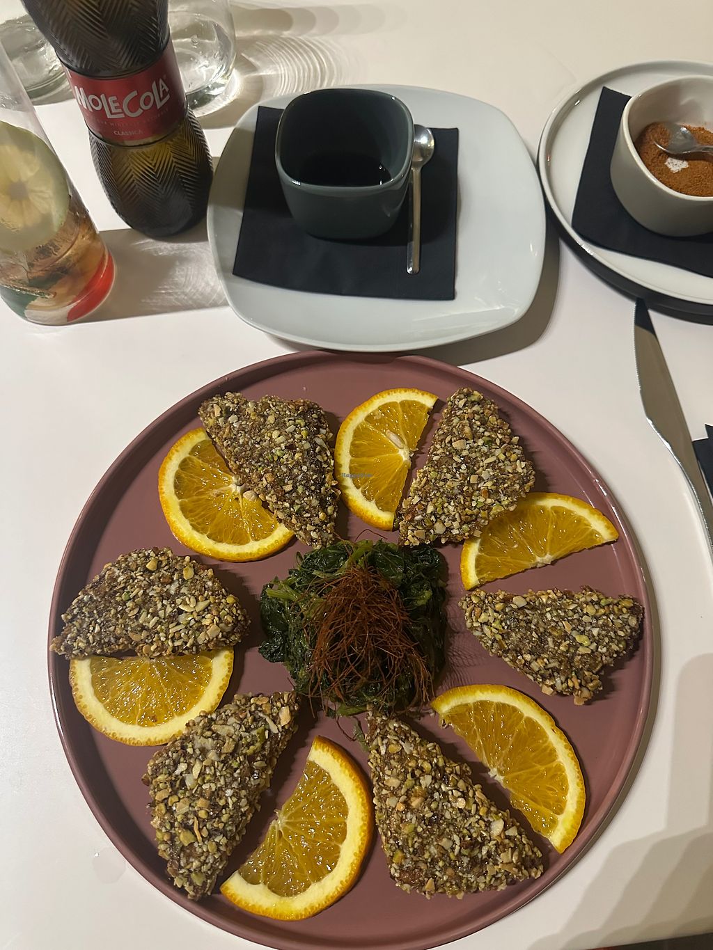 Vegan moussaka, Pleurotus, Thai soy, coconut soy, eggplants roll and s…