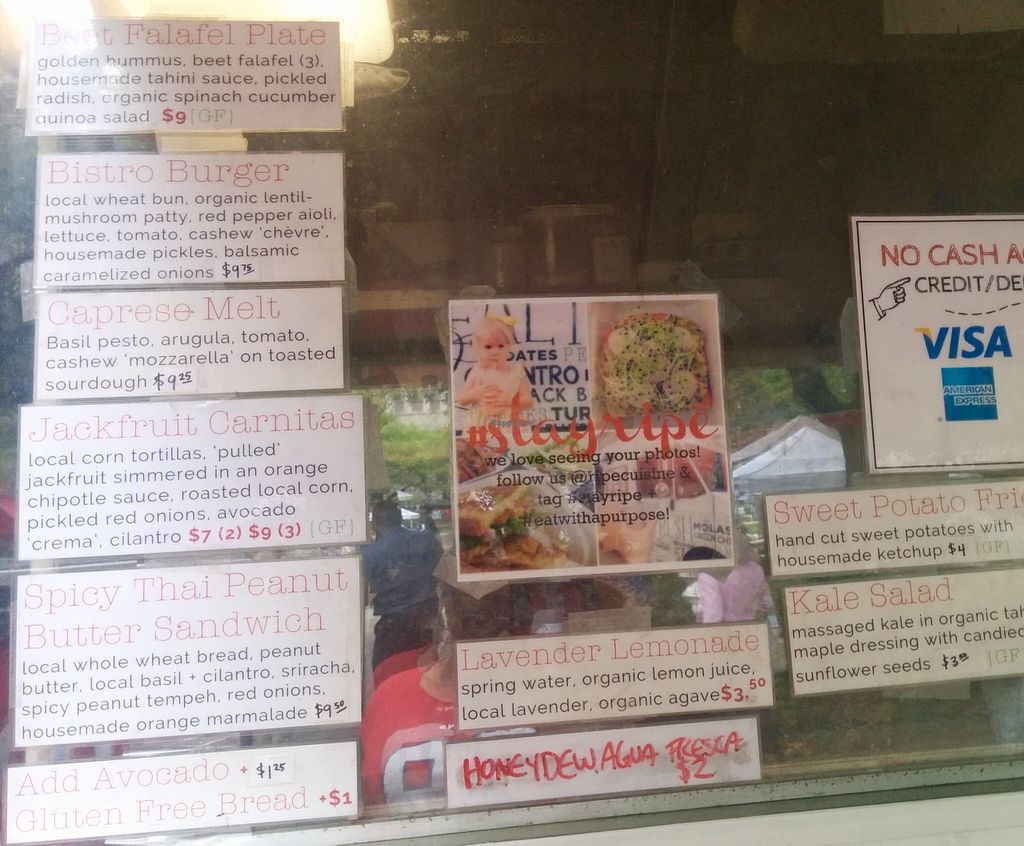 I've been to Ripe about three times now, and the food is always great - full of flavor! I've had (or tasted someone else's) grilled peach salad, tofu bahn mi, sloppier joe, squash tacos, West Coast burger, and avocado tacos. The food is always complex and layered with flavors! The best thing is that she changes her menu weekly, so you can go back the next week and try something completely different! (And try the ice cream - perfect for the hot summer!)