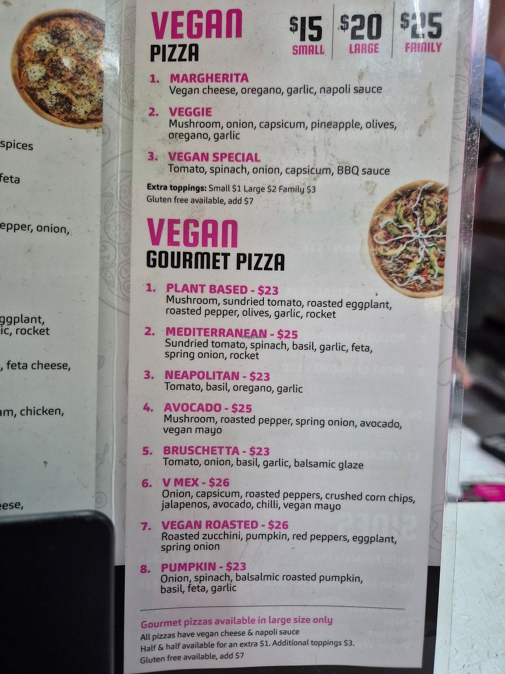 Okay, so I saw that they have vegan pizzas on their menu... but they also have a doughnut snack pack that is vegan (jam and Oreo topping) and in the freezer they have mubble ice cream tubs with 5 different vegan flavours! This is an absolute gem for vegans! They have 11 vegan pizzas options on their menu and 1 new spicy vegan flavour option on a sign in the shop. The 2 staff members who i saw yesterday were very polite and friendly. The pizzas are also reasonably priced, the family sized veggie pizza that I got was $25 and definitely enough for 3 people. I ordered over the phone and it was ready in 20 minutes. I will certainly be back!