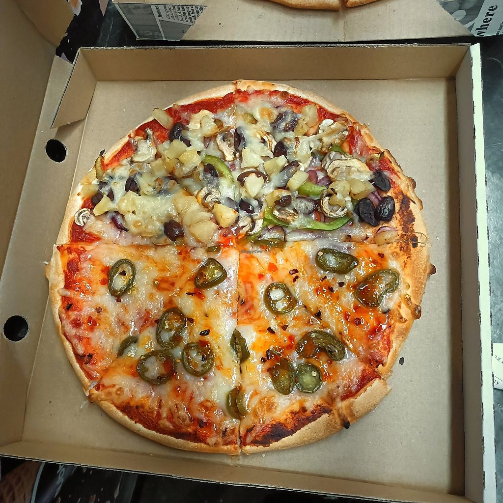Pleasantly surprised by the number of vegan options here - there's menu sections dedicated to normal vegan and gourmet vegan pizzas. Ice cream and doughnuts for dessert, pasta, garlic bread, etc. We tried the vegan half-half pizza with Vegan Veggie and Spicy Vegan. You can tell it's definitely vegan cheese (gloopy melt). The spicy vegan was the better of the two - sweet, salty, a little heat from the jalapenos and sweet chilli sauce. Vegan veggie came with mushrooms, black olives, pineapple, capsicum .