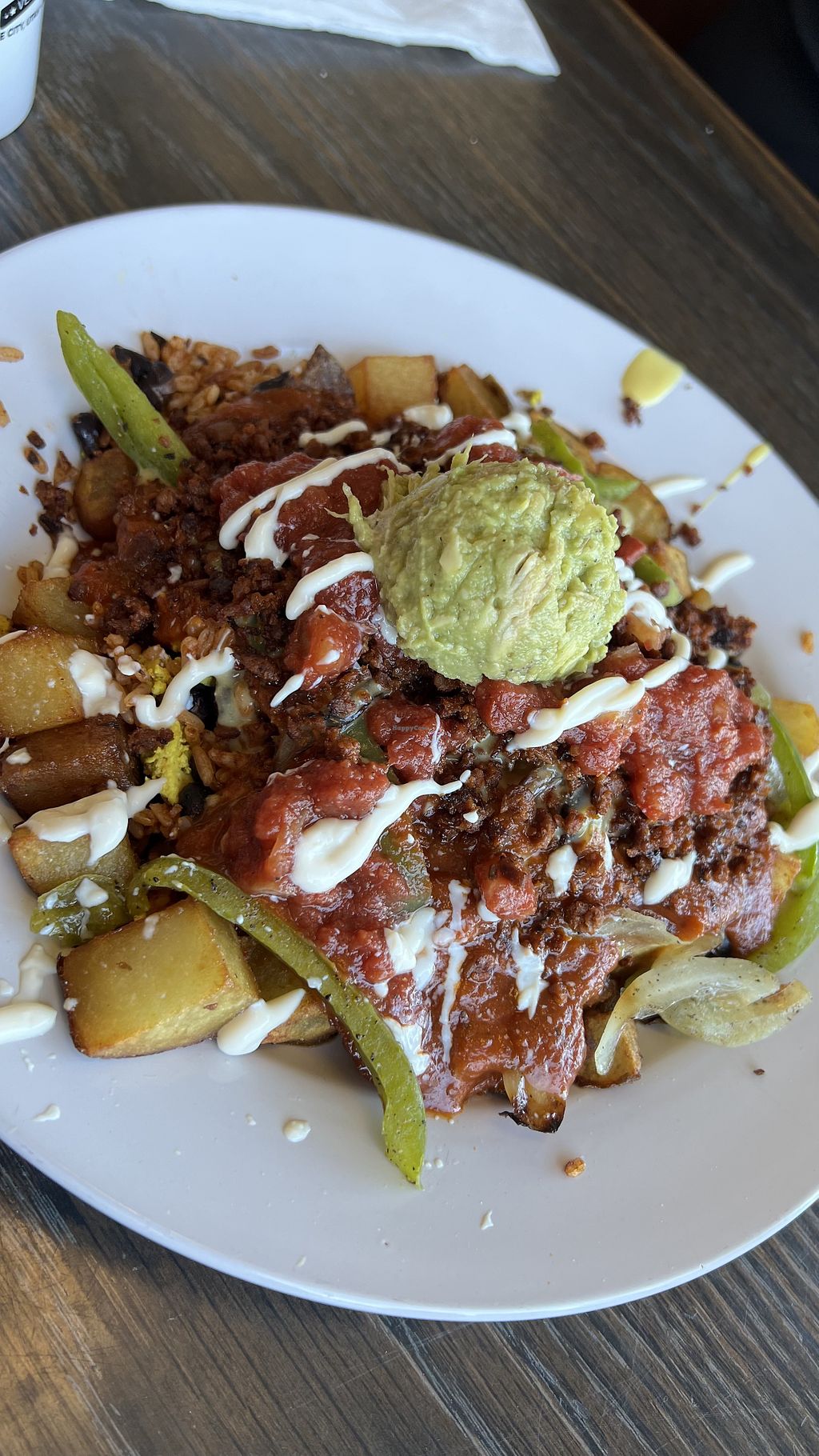I found Vertical Diner on Happy Cow. We need more vegan diners like this- somewhere you can go regularly together with non-vegan friends and family. Service was friendly and prompt. My coffee cup was always full, as it should be. The menu is broad without being unwieldy, with all-day breakfast (of course). I ordered the Mountain- country style potatoes, sauzage, tofu and guac. Great breakfast.