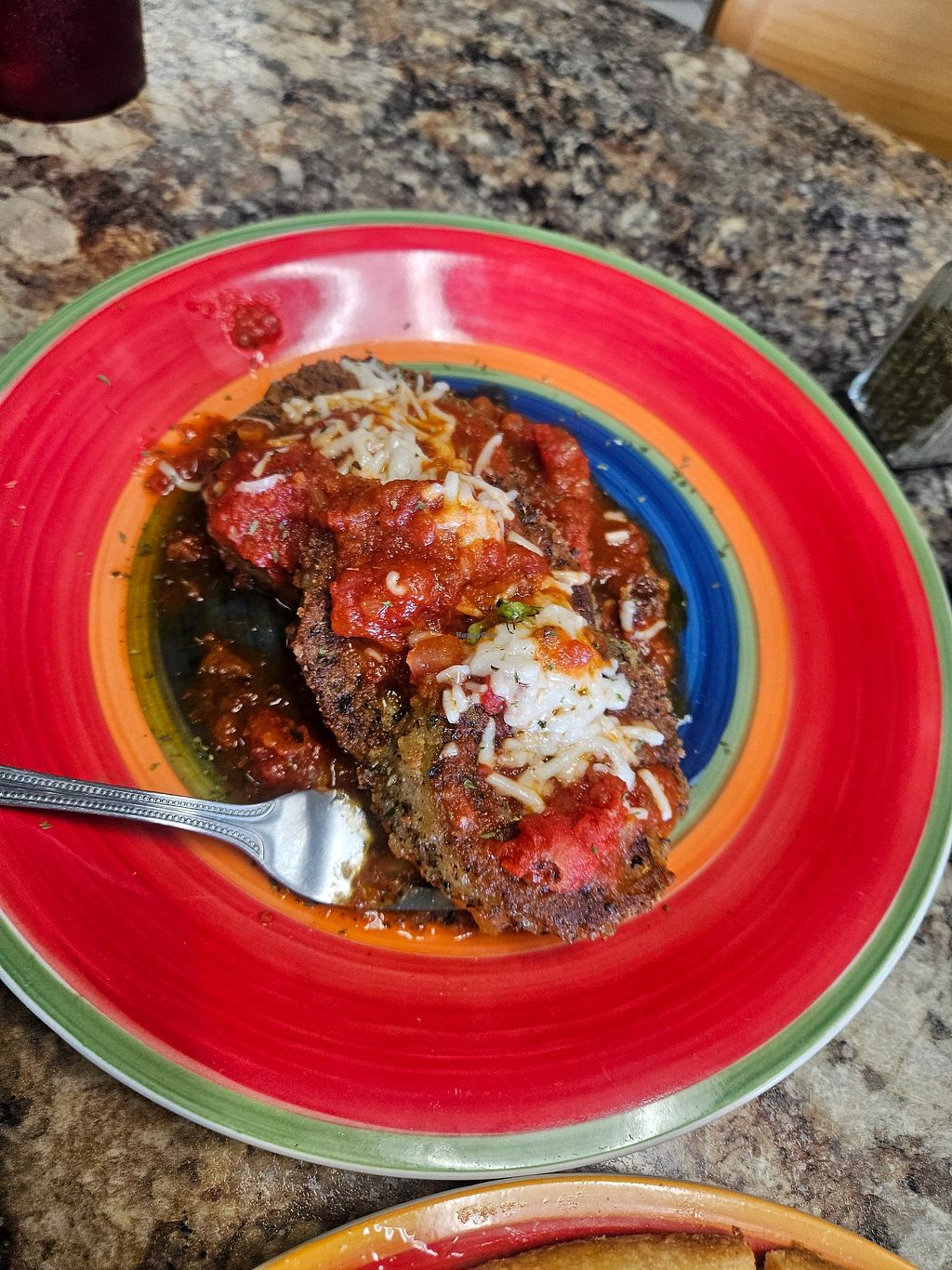 Half eaten balsamic bruschetta with daiya cheese, fresh tomatoes