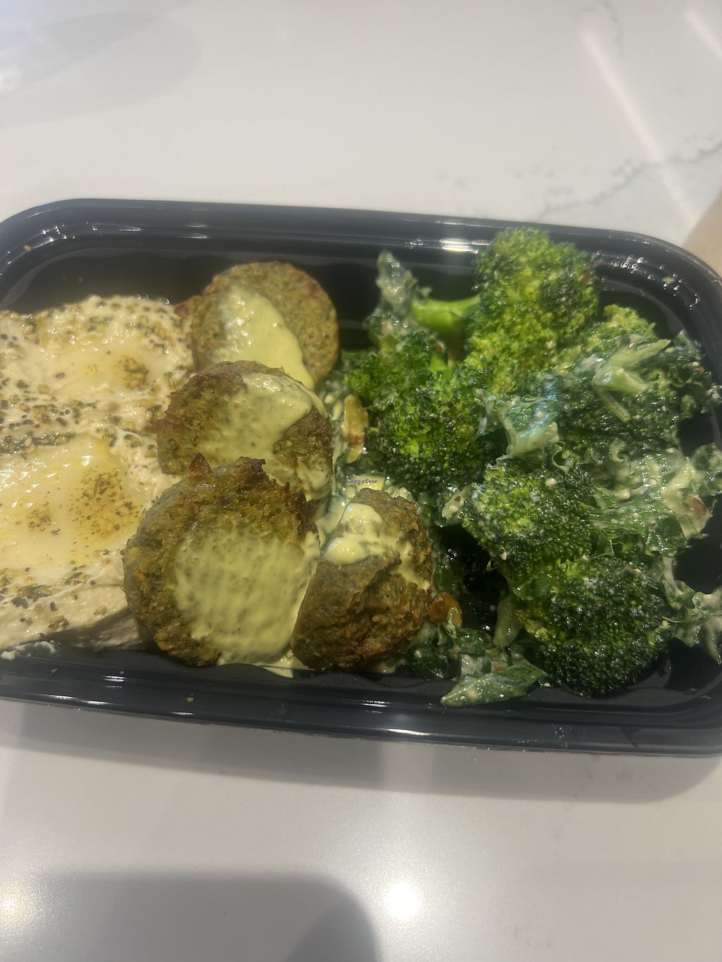 I enjoyed the falafel with hummus and cashew broccoli. Pita bread needs to be ordered, doesn’t come with the meal. Thought the bowl tasted fresh and delicious. I’d return!