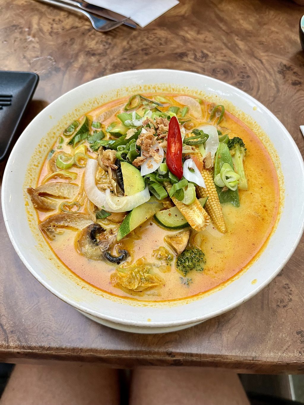 I came just in time. The owner said I had to order quick, it was just passed 9 and the kitchen was almost closing. I was happy i could still order. I wanted a big pho and and appetizer but he was like: no!! one small soup was big enough he told me and also no summer rolls. Well I listened to him and he was right. It was a big bowl with a lot of veggies tofu and rice noodles. It was really filling me up. It made happy after a long day of travelling. Good taste like a Vietnamese soup should taste like. Some seats outside in a nice quite street. I would def go back to t try other dishes. the menu looked very good. And very good prices and good portions.