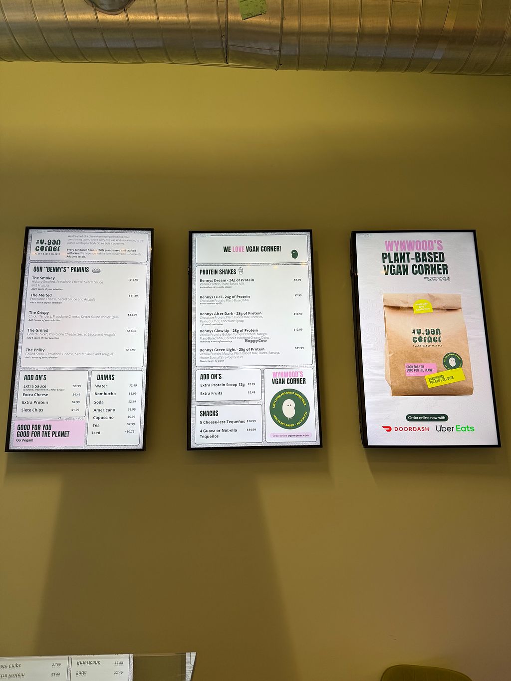 Plant-based market and deli offering a wide selection of vegan products. The menu features 'Benny's Paninis' with fillings like grilled steak, chicken tenders, and smoked provolone with secret sauce. Protein shakes are customizable with bases like vanilla or chocolate protein and various plant milks. The market section stocks over 300 items, including frozen mock meats from brands like Daring and Gardein, as well as dairy-free cheeses. Hot snacks such as cheese-less tequeños are also available. Open Mon-Thu 9:00am-9:00pm, Fri-Sat 9:00am-10:00pm, Sun 9:00am-8:00pm.