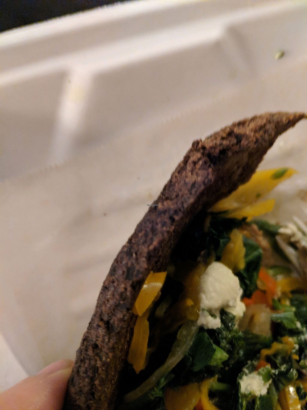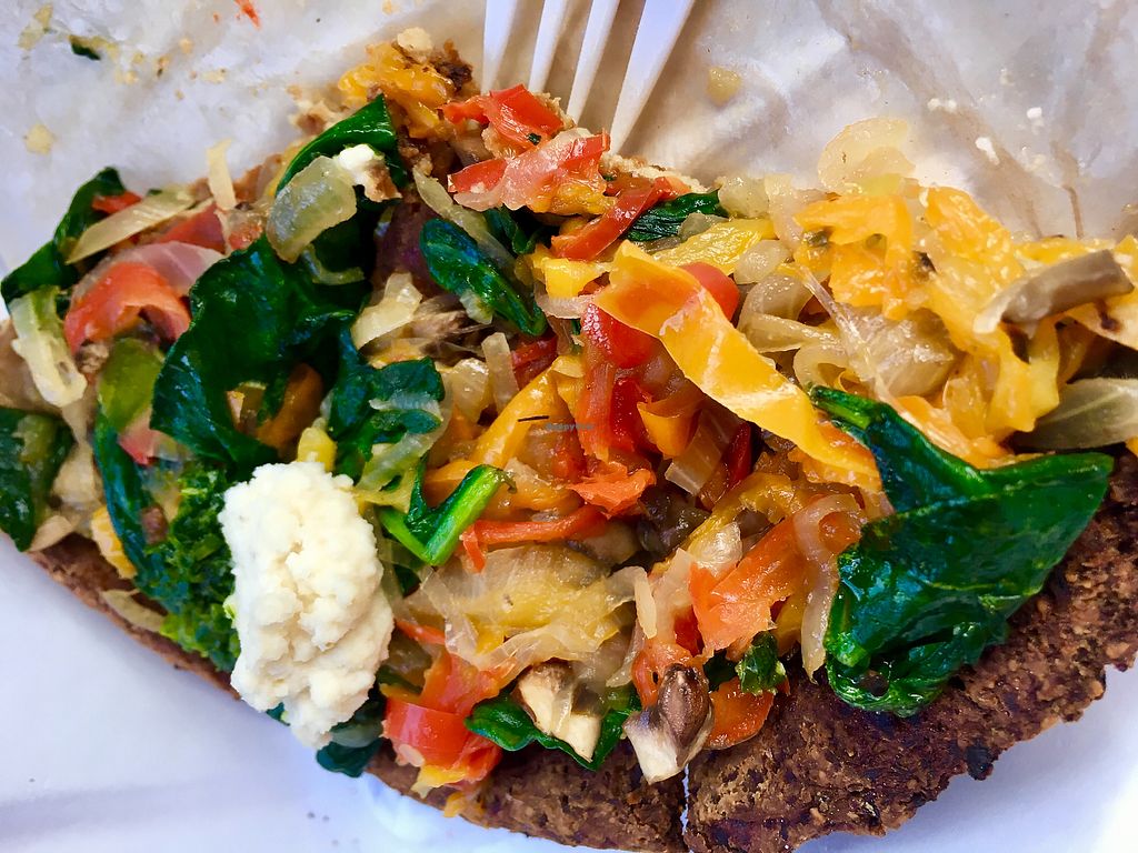 Cauliflower Pizza: basically a dry (some parts burnt and bitter in taste) cauliflower patty loaded with cooked veggies and 4 dabs of almond cream cheese. Nothing even resembling pizza in flavor which would be fine if it was actually good. It was really dry and had no sauce other than the tiny amount of cheese which was gone in 4 bites.