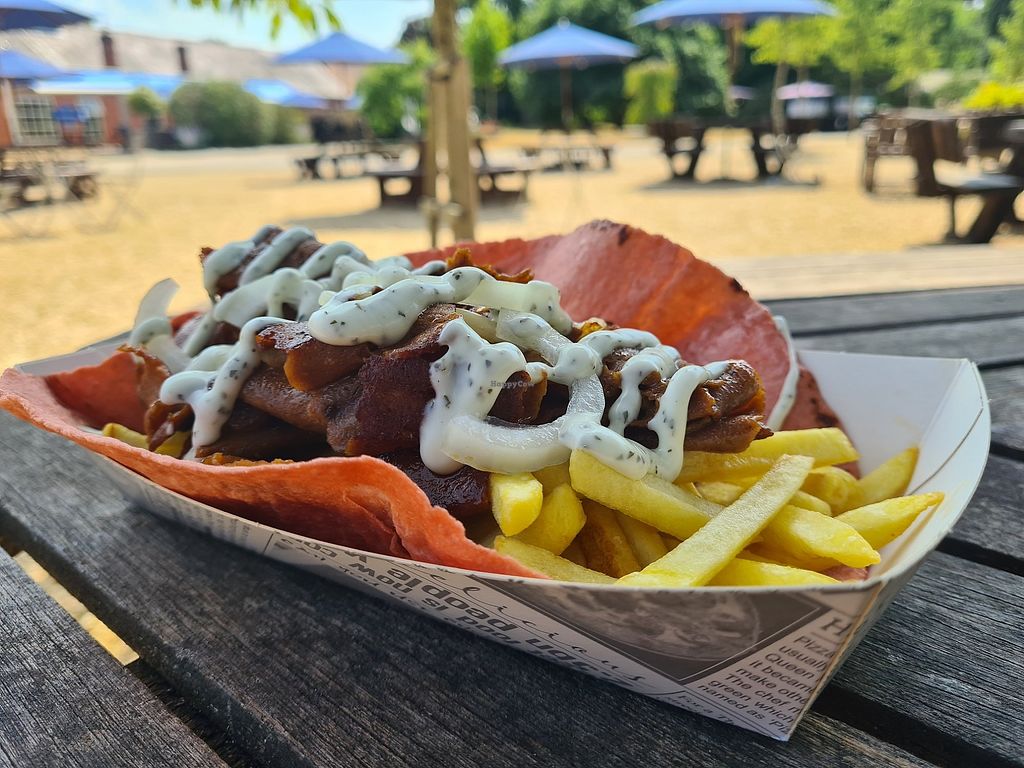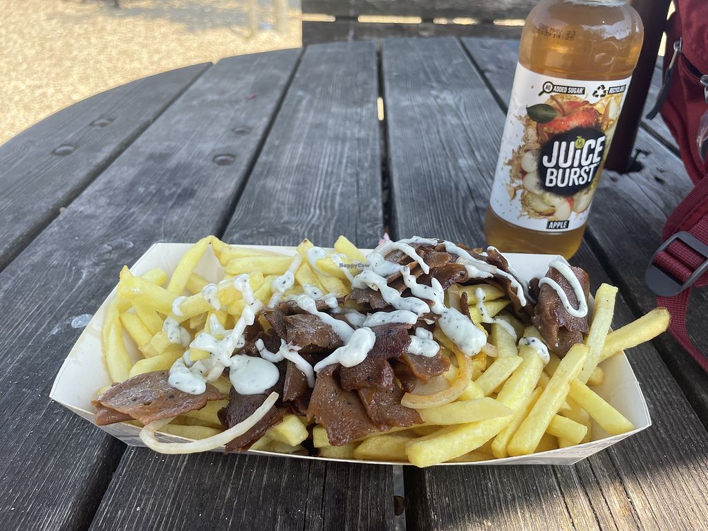 Chilli chips, meatballs chips and gravy, hot choc and latte