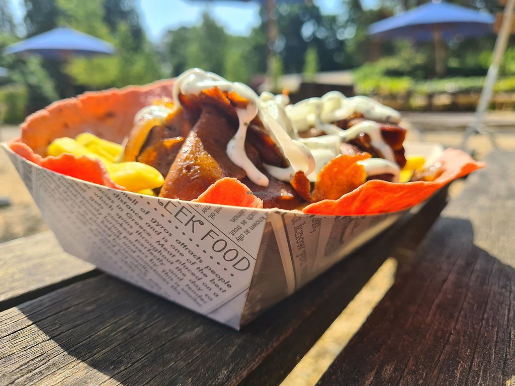 Top is ribs with chips and pineapple salsa; bottom is donner kebab.