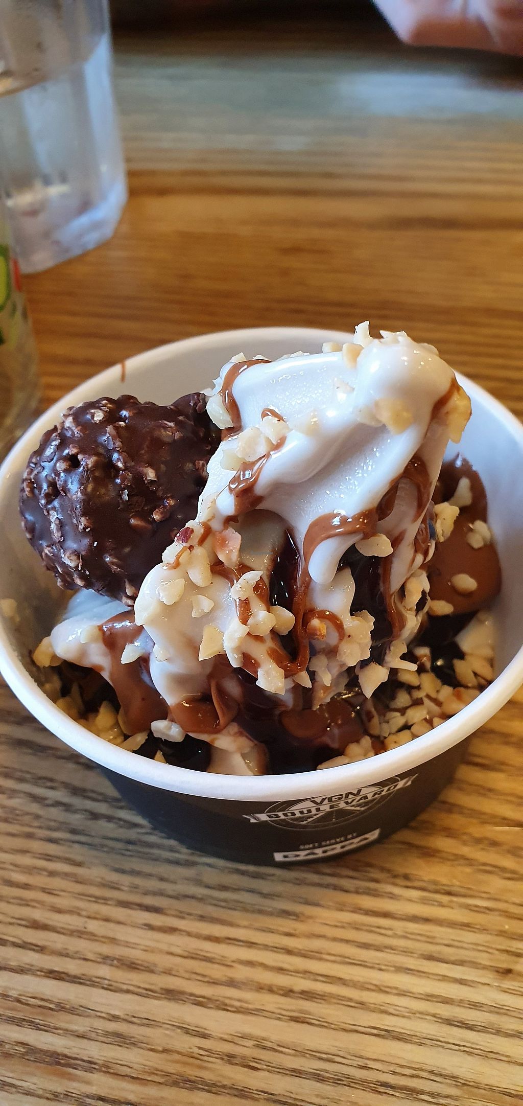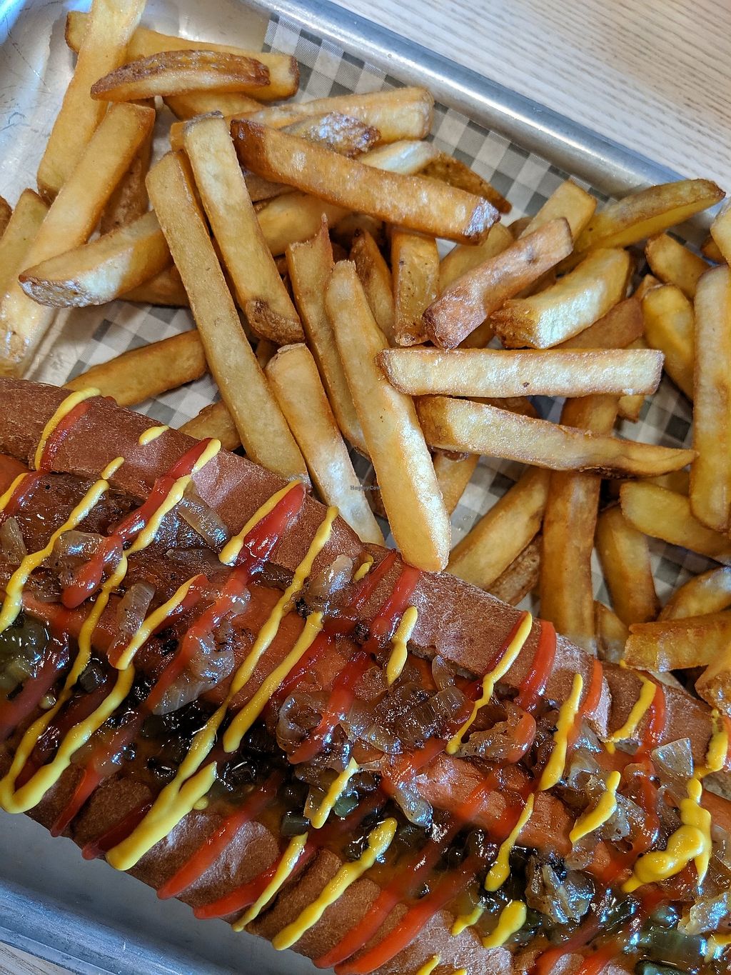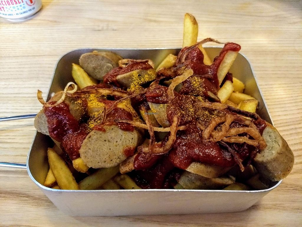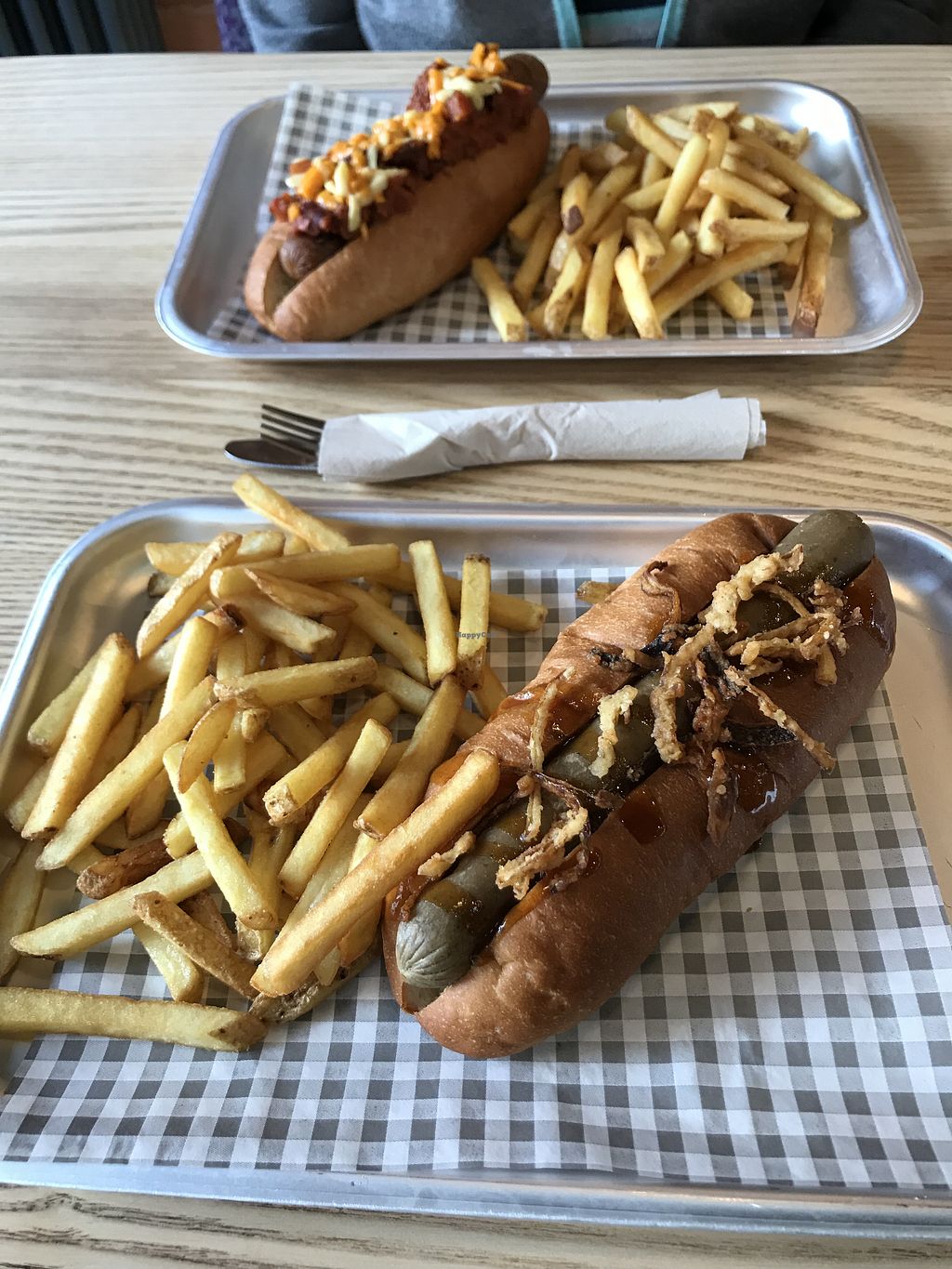 [back] Chilli Dog, [front] Hot Dog w/ crispy onions and curry sauce