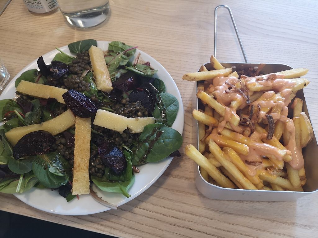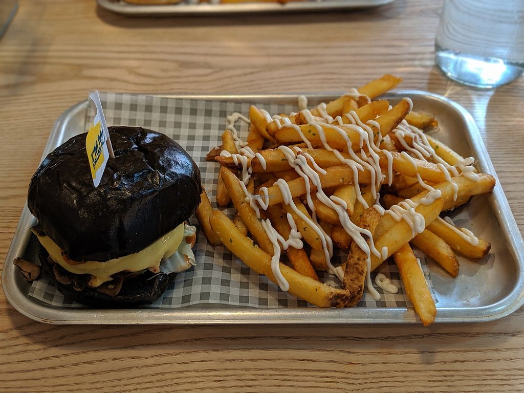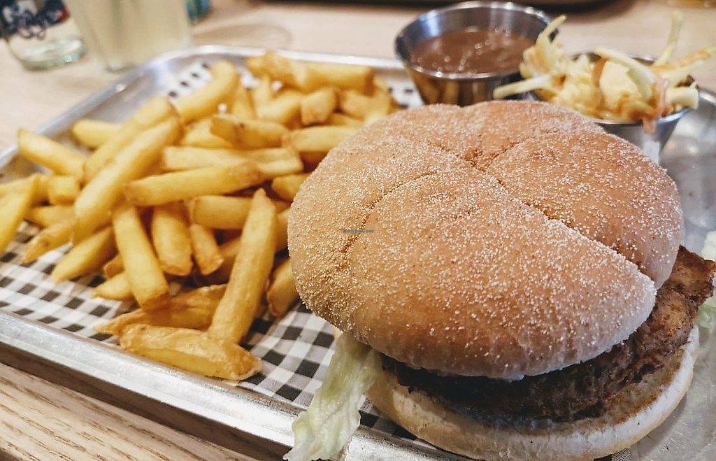 Royale burger (cheeze burger) with garlic fries and kimchi Cole slaw