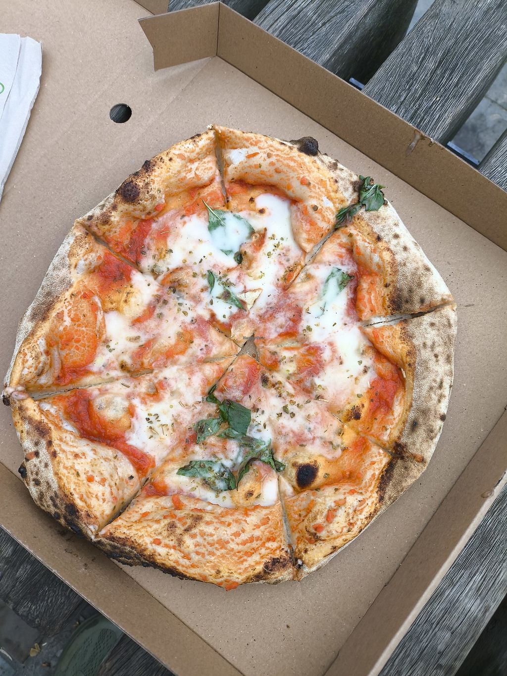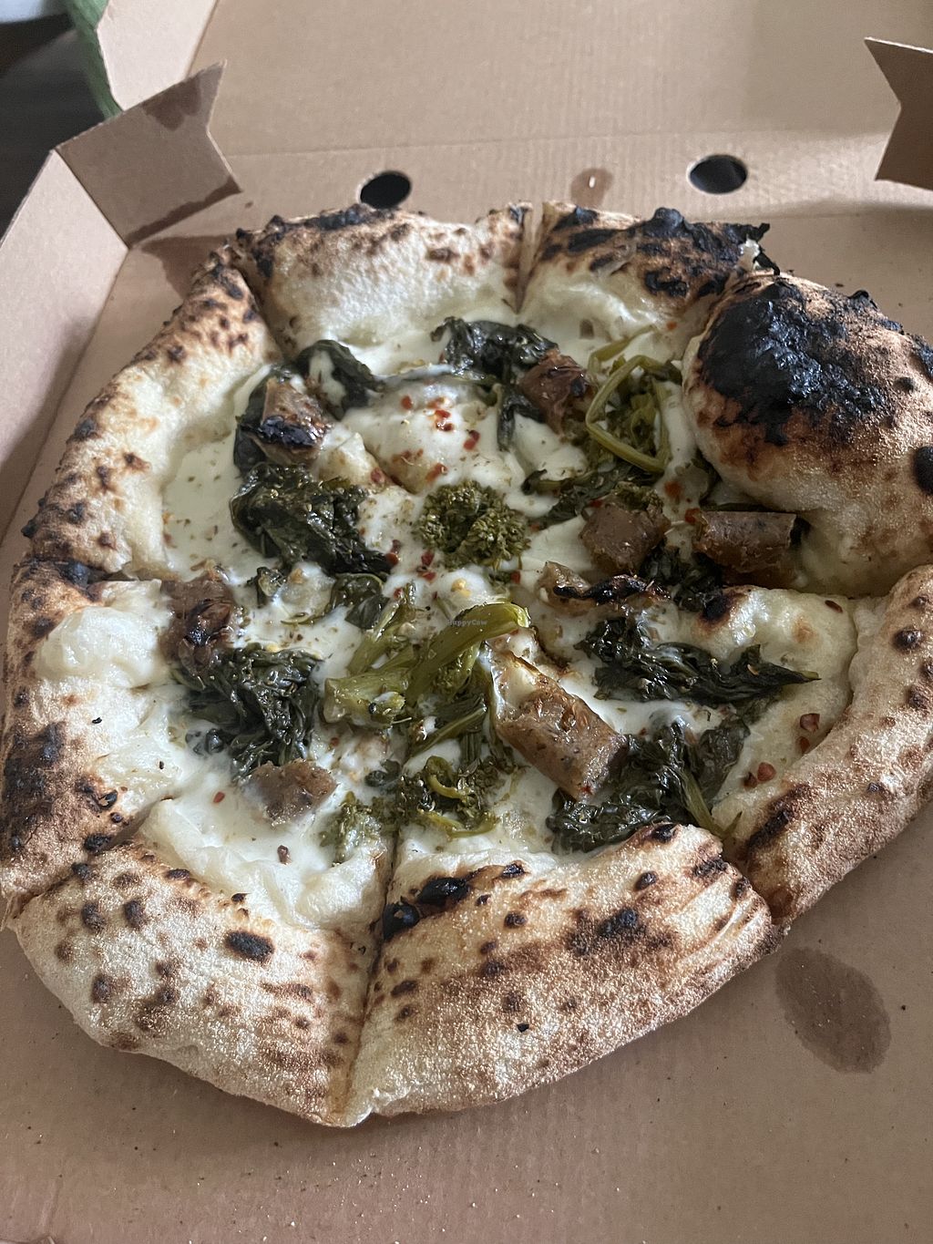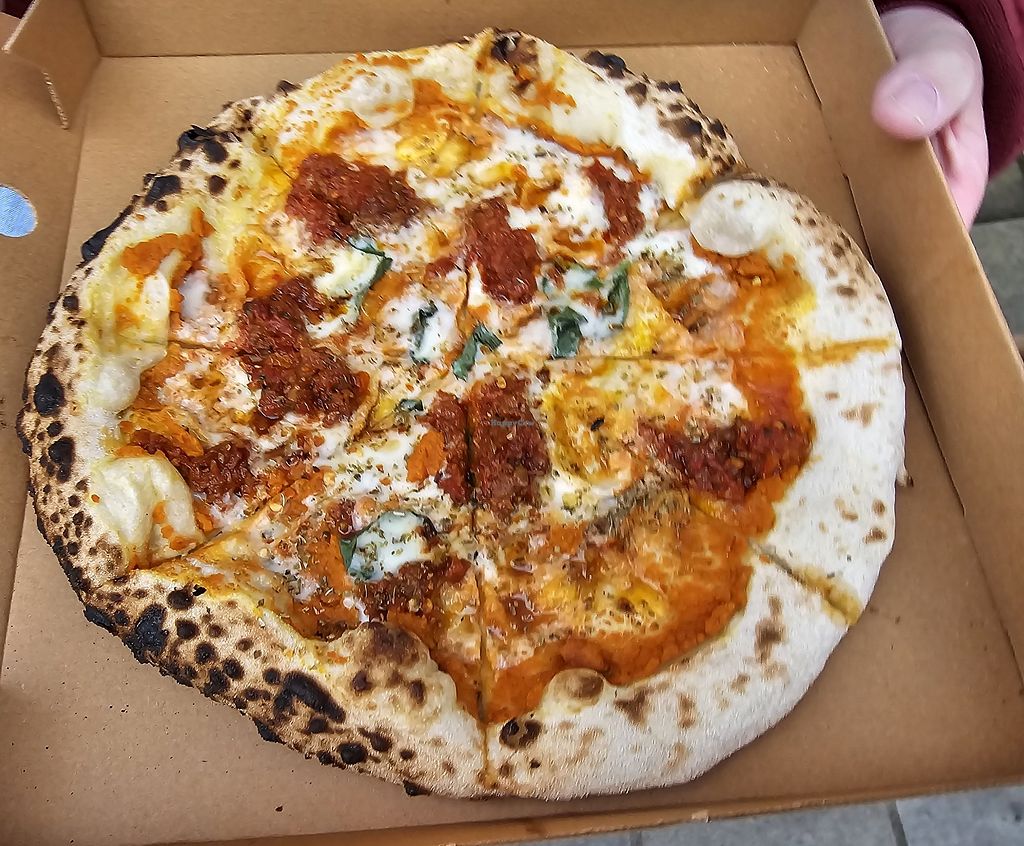 Super light base with a fluffy crust and amazing toppings. I went for the pumpkin nduja, it was so good.