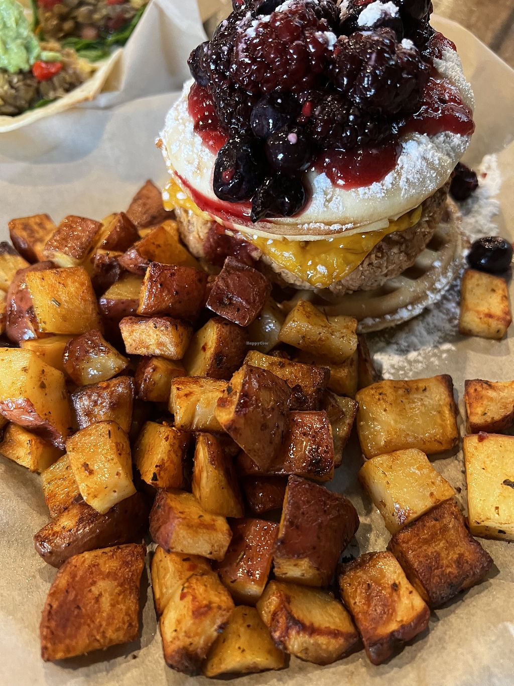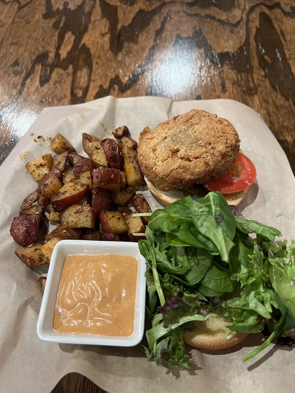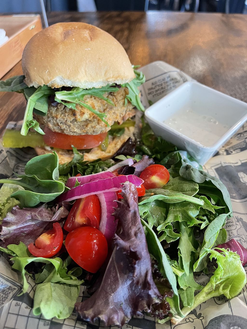 Vibe Burger on a gluten free bun with vegan cheese. Yum!!