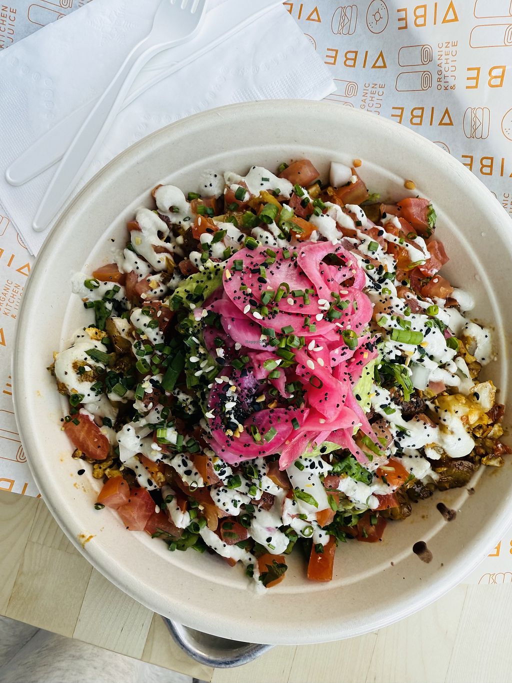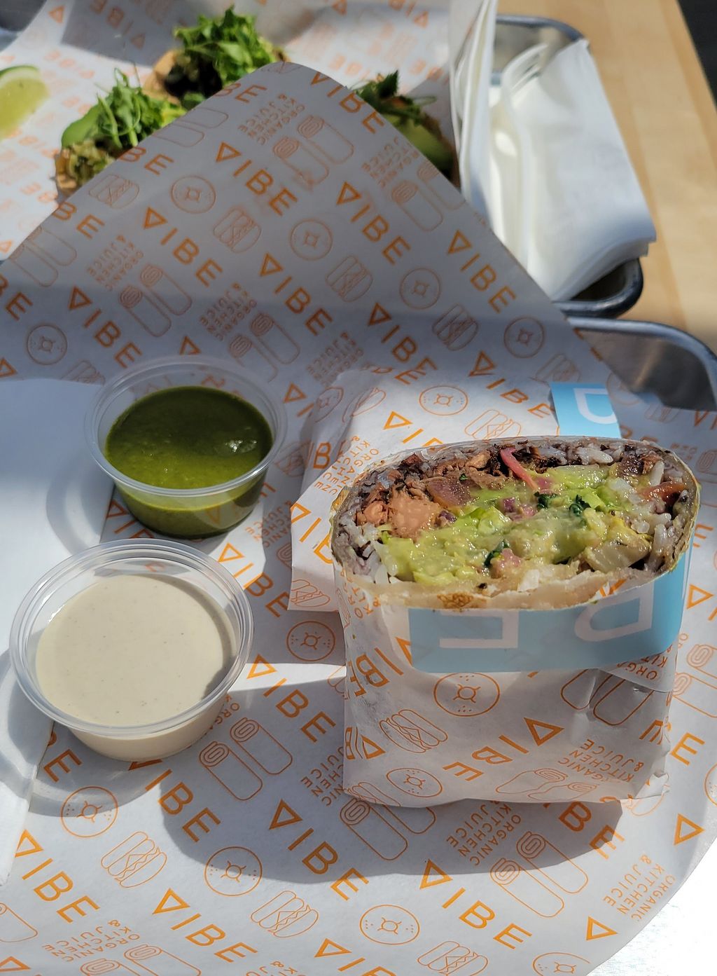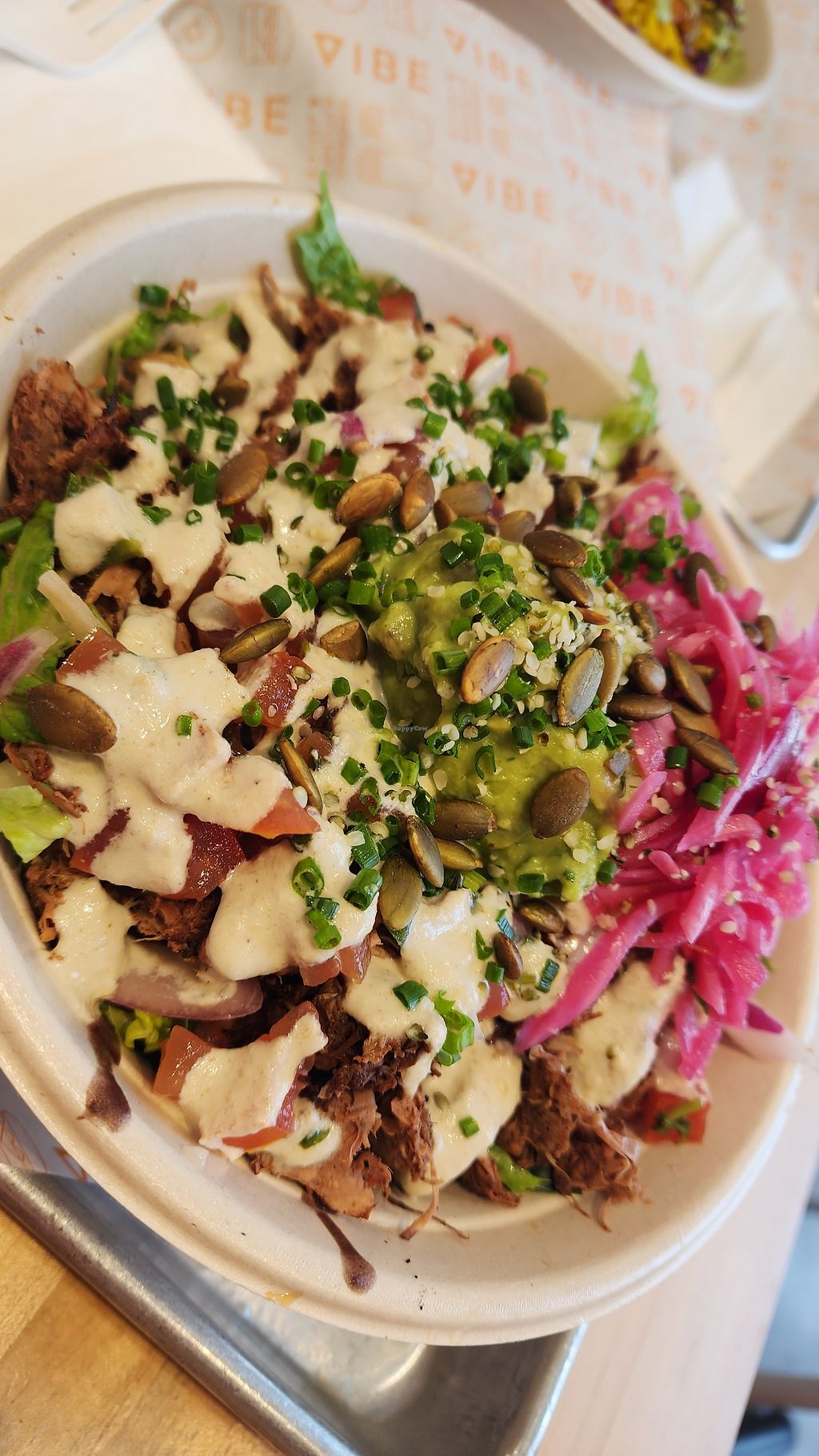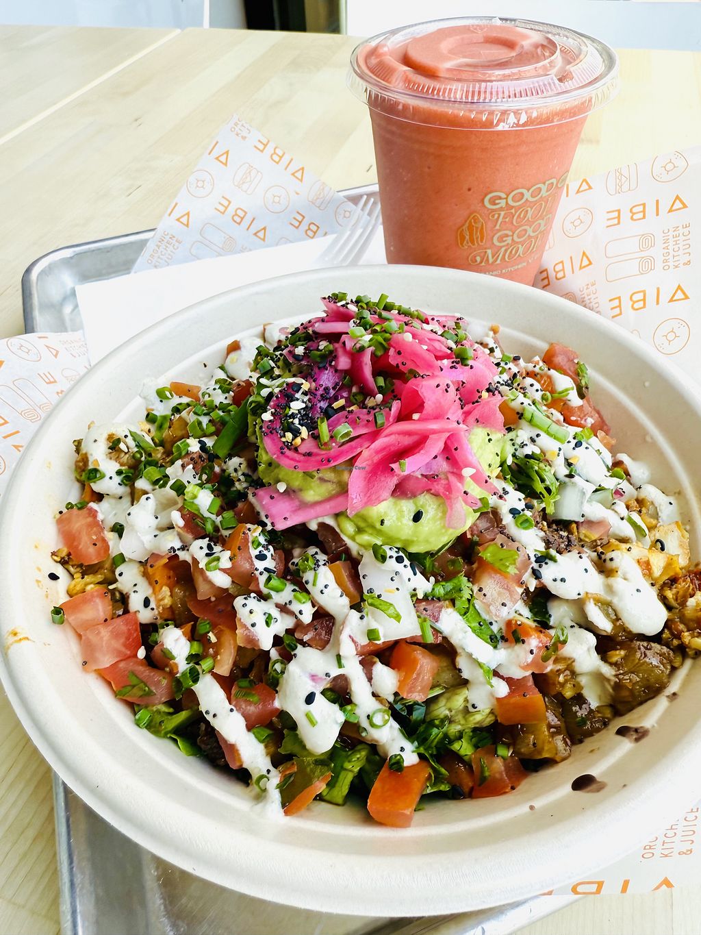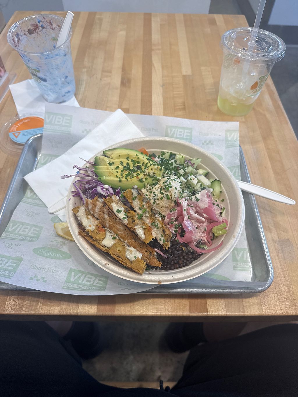 Read moreVibe Organic Kitchen in Dana Point is hands-down one of the cleanest, freshest, and most delicious vegan restaurants of all time. Their Mediterranean Bowl is my all-time favorite — loaded with chickpea fritters, shredded purple cabbage, chopped cucumbers and tomatoes, creamy hummus, a flavorful tahini-style dressing, and perfectly ripe avocado on top. It’s honestly the most delicious bowl I’ve ever had in my life.