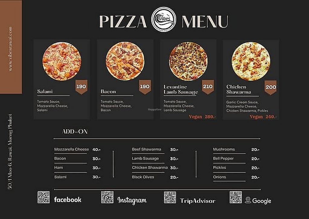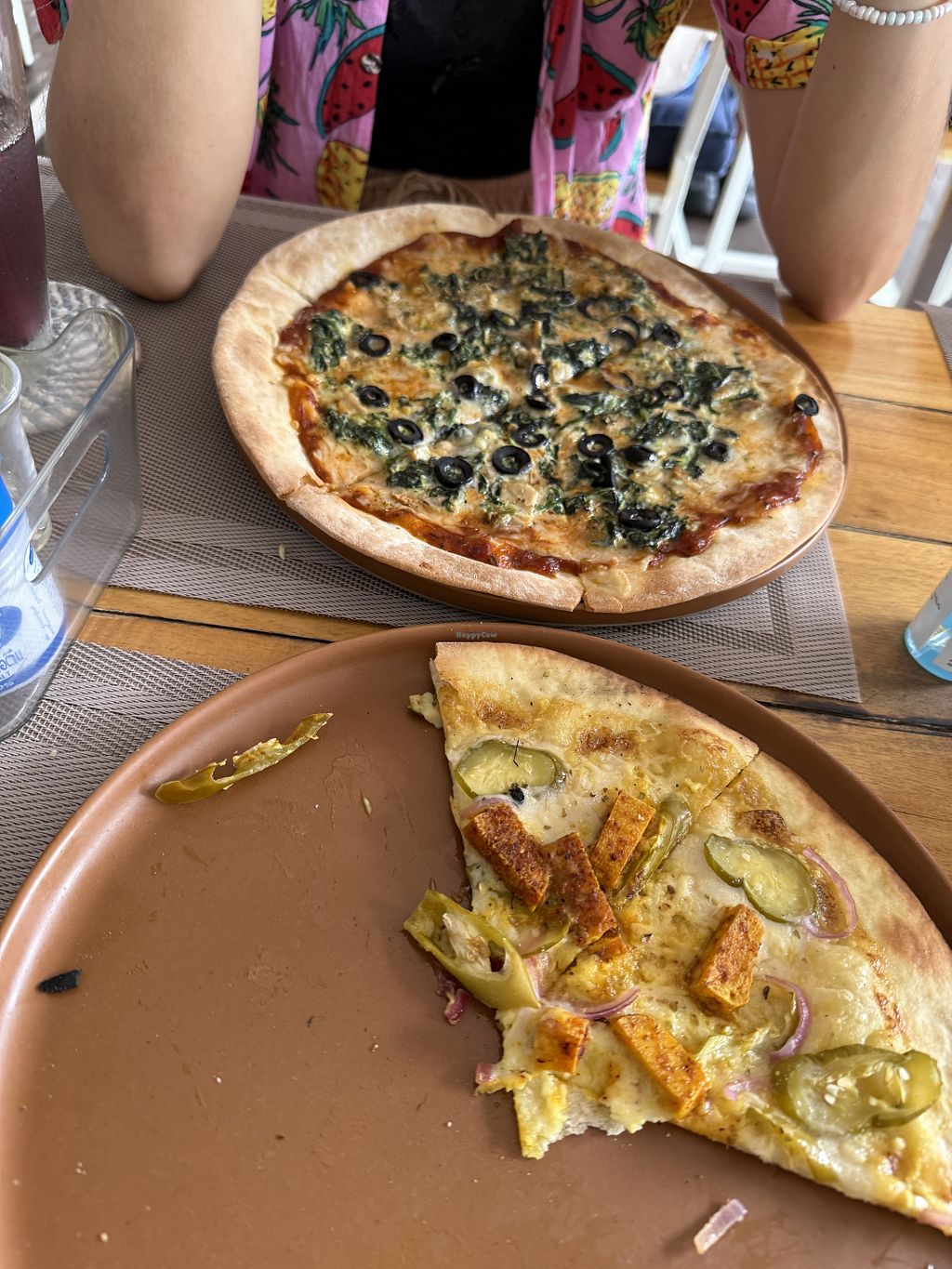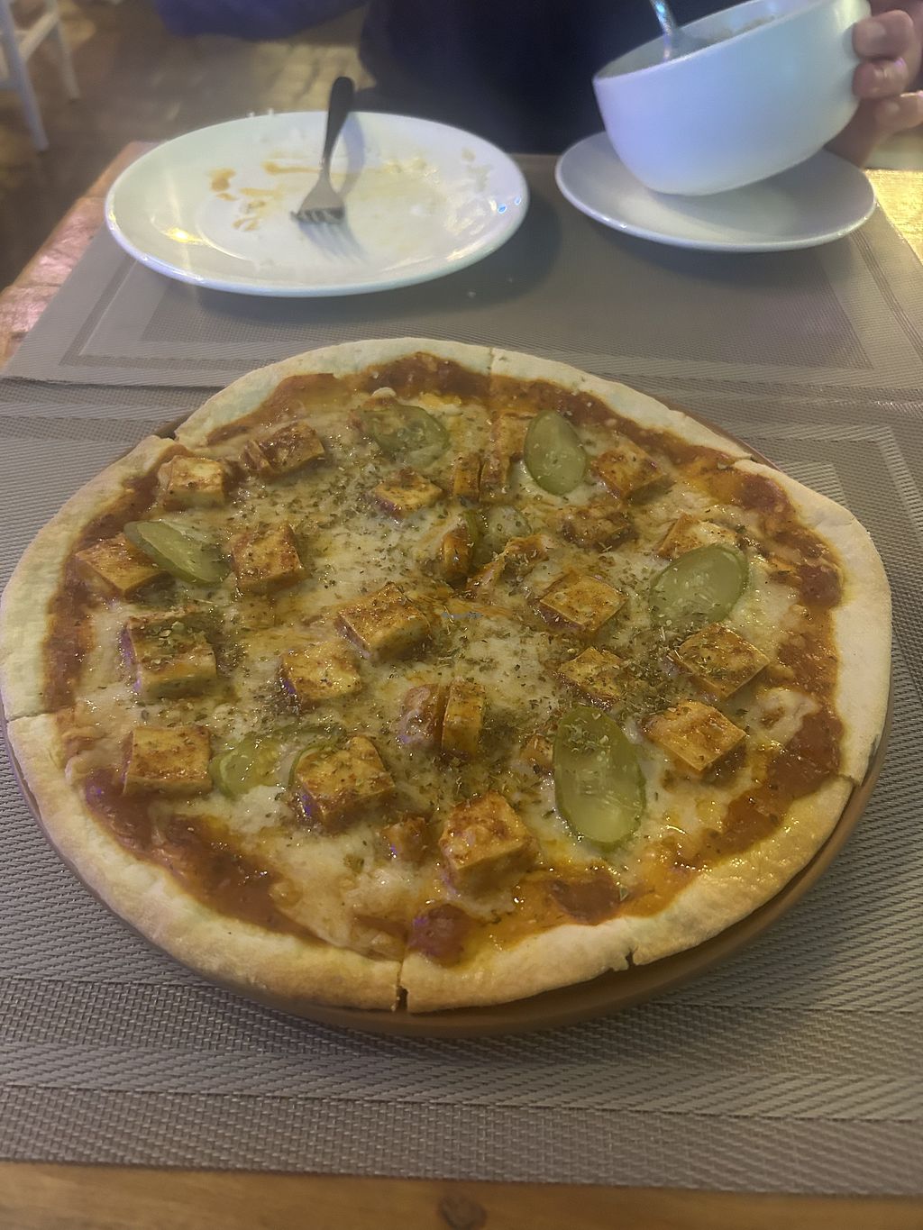 I can understand that the pizzas are not so cheap but more than 300 Baht for a burger makes no sense to me. We ordered pizzas and they weren't really that good. Decent but not so tasty that they justify the price. My meat eating company also didn't like the non vegan ones. I think Pizzas are just not their speciality at all. So if you come here I'd recommend eating anything else.