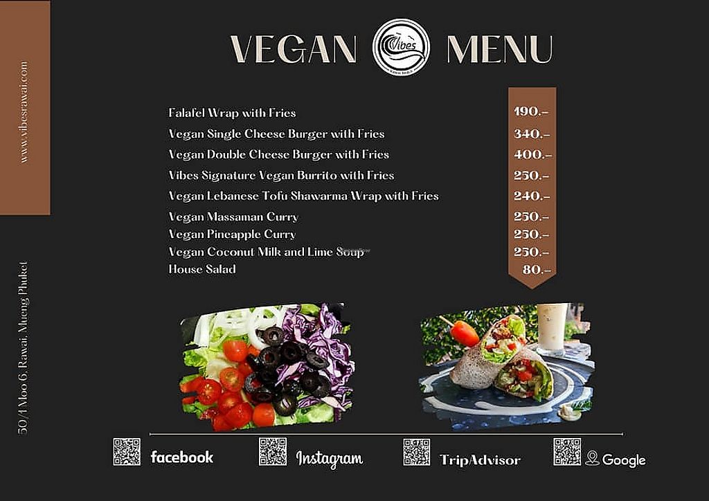 Serves meat, vegan options available. Seaside restaurant with many vegan options. Has a bar, restaurant area, space for an art exhibition and a small music stage for live music. Vegan dishes include pizzas, falafel, hummus, fries, falafel wrap, vegan double cheeseburger, vegan burrito, vegan shawarma, and vegan Thai food such as massaman curry and tom kha soup. Reported in July 2022 that is currently working on a full separate vegan menu with extensive information such as gluten-free and allergies. Relocated from 1 Wiset Rd. Open Mon-Tue 8:00am-12:00am, Thu-Sun 8:00am-12:00am. Live Music Fri-Sun, Closed Wed.