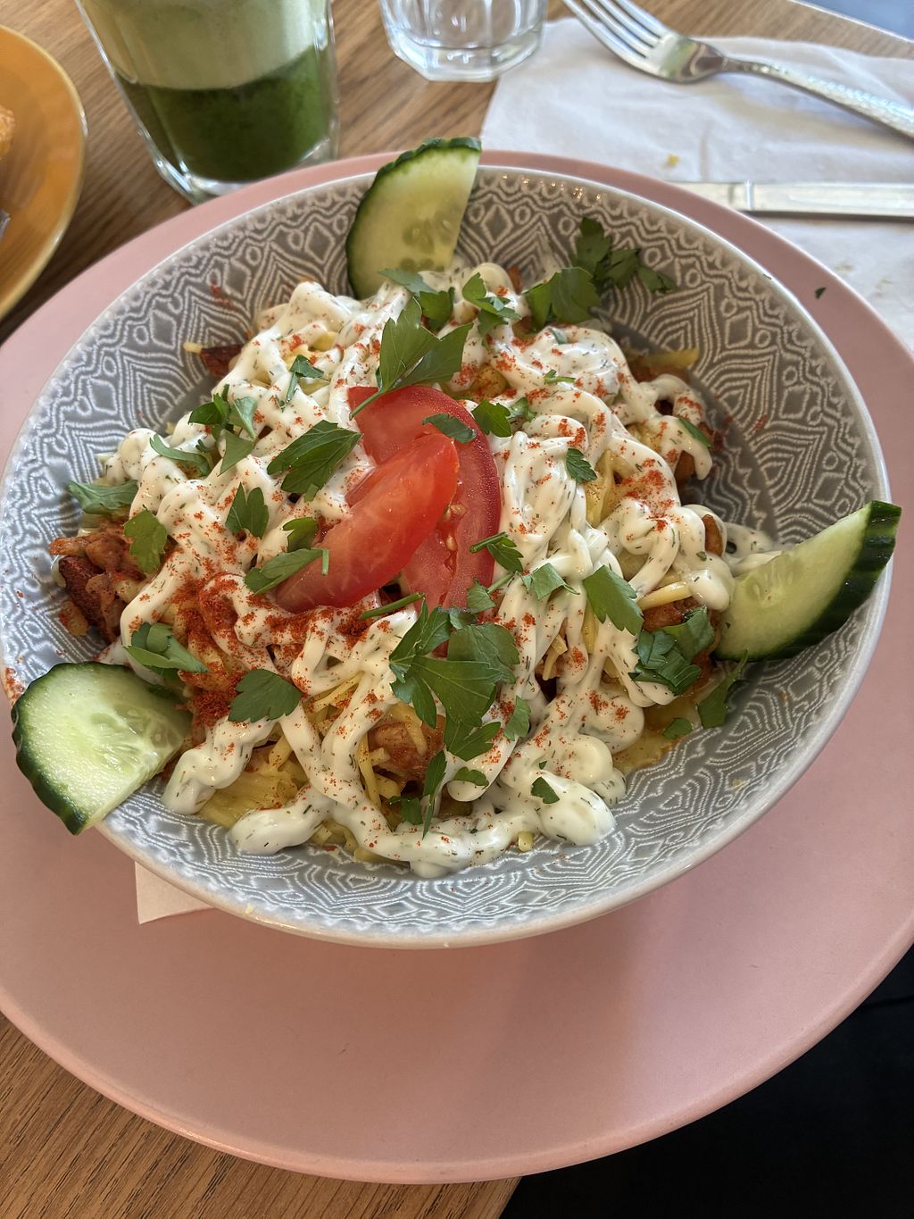Really tasty food - we especially enjoyed the falafel wrap and mushroom schwarama, and beetroot/turmeric lattes. Syrian proprietor very friendly and helpful. Delightful decor and vibes (obviously) 😁