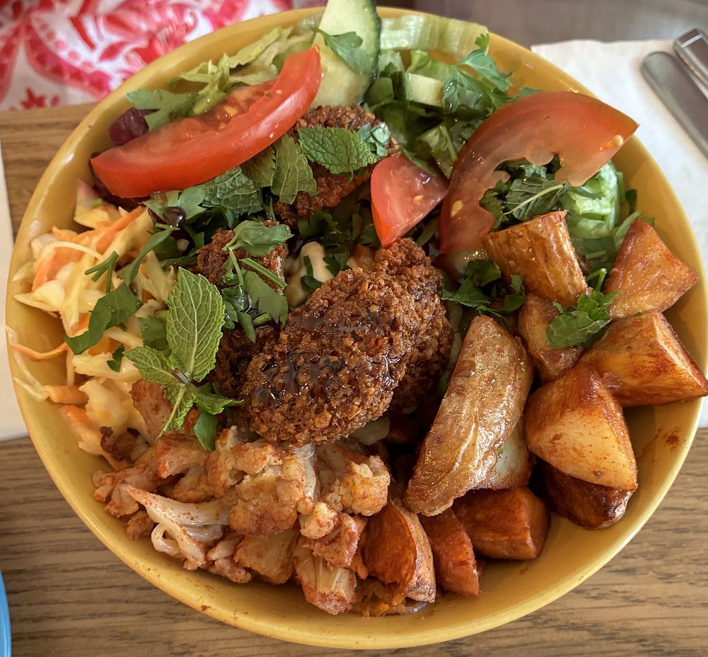 Stopped off for a quick lunch while in Dorchester. Staff were lovely and cafe had a cosy feel. Food took quite a while to come out and some items were unavailable by the time we visited (around 1pm) but when it did arrive the food was very tasty. The falafels were particularly good. Lentil soup was delish and great value for money.