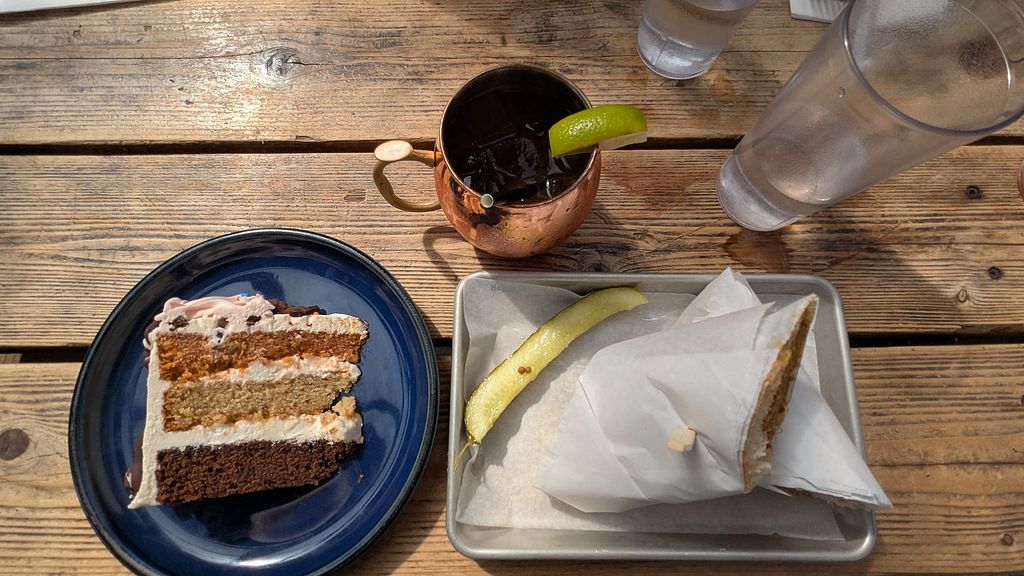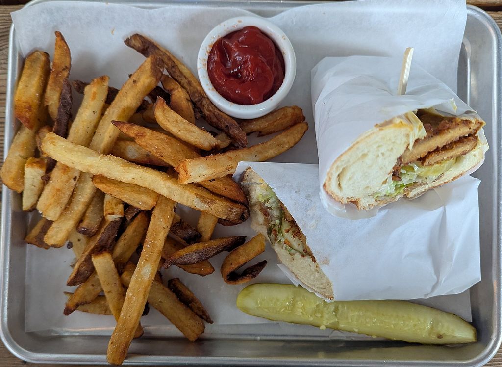 The Phoenix sandwich w/ fries + California Breakfast Burrito— both veg…
