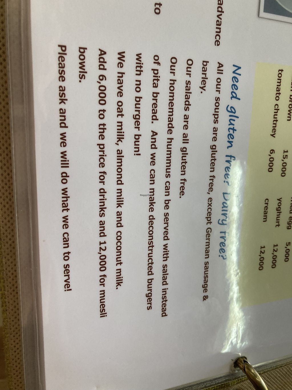 Ordered the falafel pitta minus yoghurt which was massive! We also had hash browns on the side (incred) and ordered smoothie without yoghurt. The staff were very accommodating.