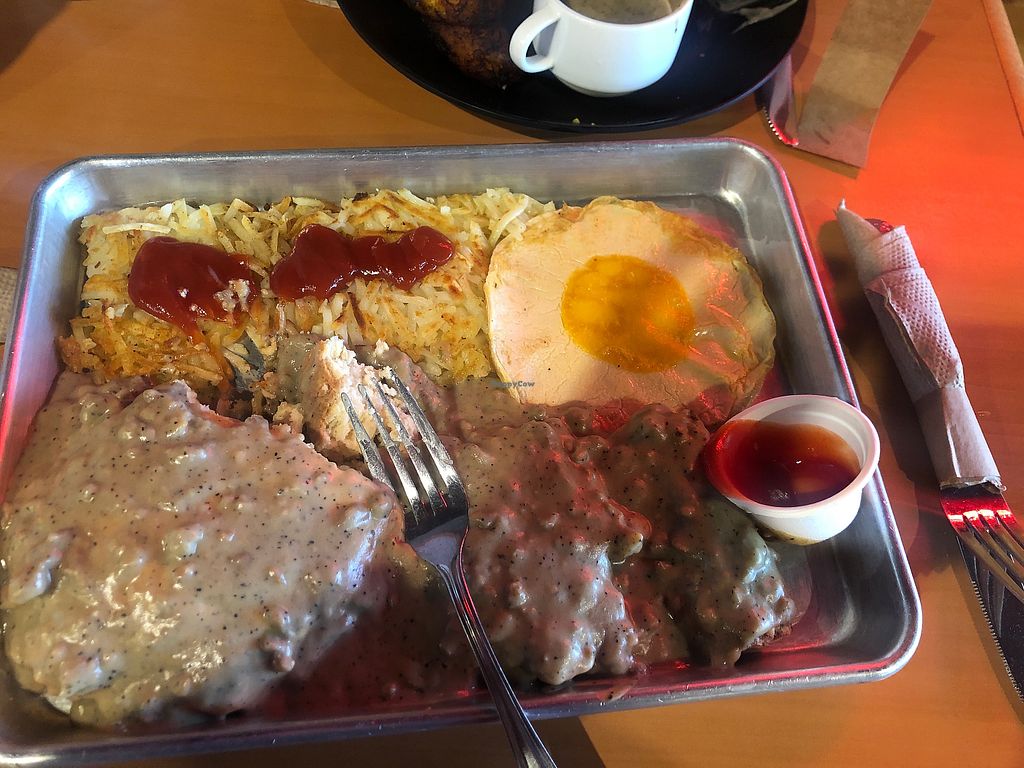 Unexpected find in bakersfield. Good variety of menu options. Really enjoyed my Chickn Burger and the caesar salad. My toddler enjoyed the country potatoes and seitan as well. Oh and they have everything a sweet tooth enjoys too. Outside covered patio is cozy even though its close to the road