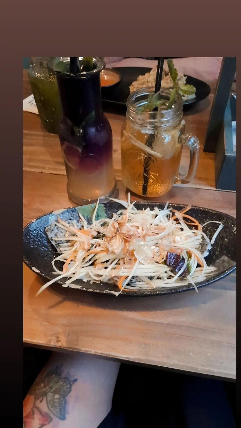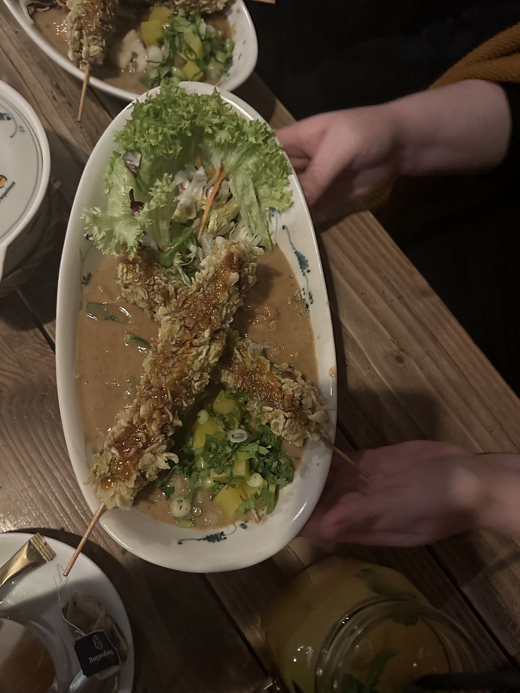 We came here after trying to eat at a veggie restaurant down the street that had only a soup and fries as vegan options. Big veggie menu although not clearly labeled what is actually vegan. The food was alright, my husband loved his rice dish and I liked my noodles, though the wonton soup and the summer rolls were only mediocre. Biggest downfall for us was the service. We were greeted and served by 3 different people but none of them thought to offer us a child seat. My husband even said, ‚they would surely offer us one if they had it, right?‘ And sure enough after our meal I saw it on the way to the bathroom. Our meal could have much more enjoyable if we didn’t have to hold our baby when we ate. Big big no no on top of that was also that there was a nail sticking out of the table on the side my baby and husband sat and he ripped his sweater while picking something off the floor. This could seriously harm someone but when we made them aware it was shrugged off with the words ‚it will be taken care of‘. No apologies, nothing was done to make up for our broken clothes or inconvenience. We won’t be back