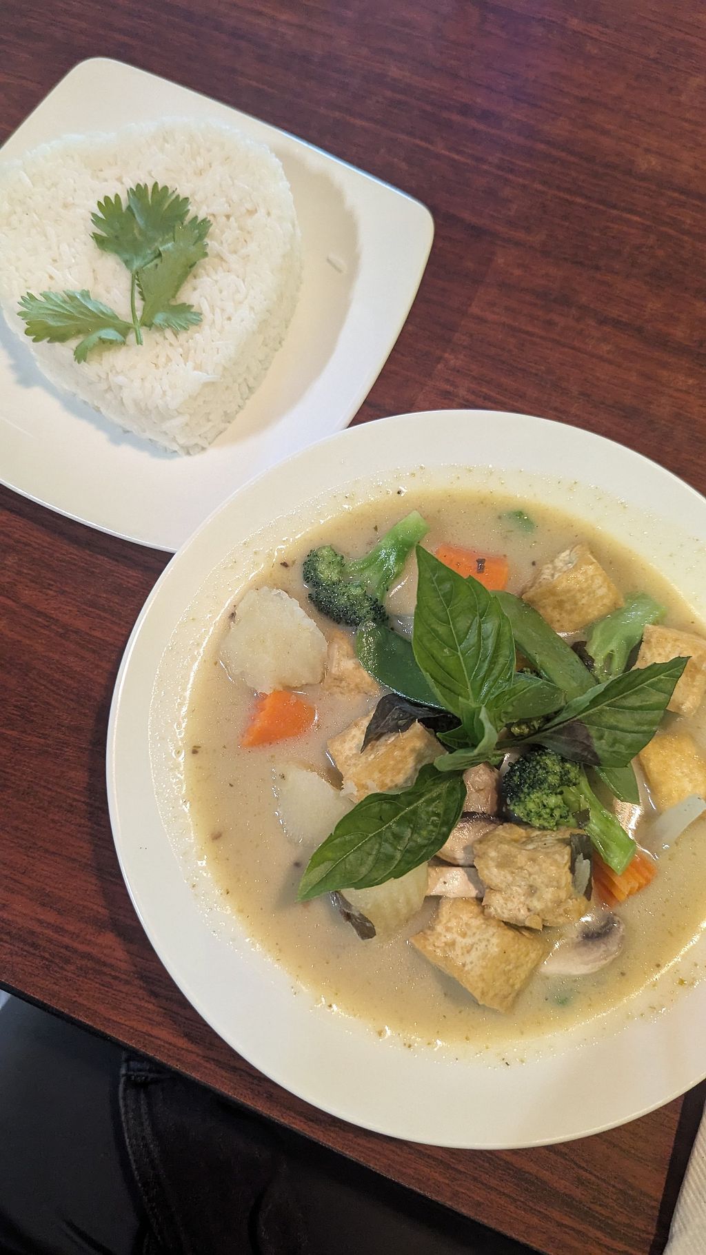 Green curry with tofu and white rice